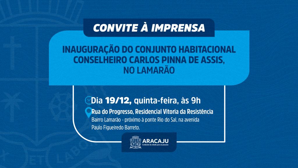 A Prefeitura de Aracaju convida a imprensa para acompanhar o ato de inauguração do conjunto habitacional Conselheiro Carlos Pinna de Assis, nesta quinta-feira, dia 19, às 9h, no bairro Lamarão.
