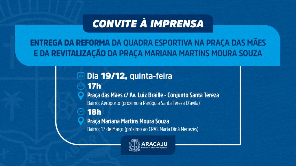 A Prefeitura de Aracaju convida a imprensa para acompanhar a entrega da reforma de quadra esportiva na Praça das Mães, às 17h, no bairro Aeroporto, e a entrega da revitalização da praça Mariana Martins Moura Souza, às 18h, no bairro 17 de Março.