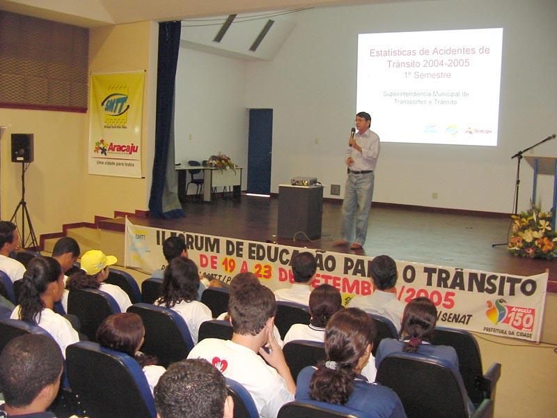Falando para uma platéia de estudantes e motoristas de ônibus e táxis, o superintendente da SMTT, Bosco Mendonça, encerrou na manhã de hoje, 23, o II Fórum de Educação para o Trânsito, iniciado na última segunda-feira. O evento foi realizado todos os dias no auditório do Sest/Senat, na avenida Tancredo Neves. O tema da palestra foi A nova sistemática na operação e fiscalização do trânsito em Aracaju. Como a Superintendência Municipal de Transportes e Trânsito (SMTT) está executando o novo sistema de operação e fiscalização no trânsito, a partir disso a cidade será dividida em três postos de observação do trânsito. O primeiro sistema já está funcionando em caráter experimental e vem dando bons resultados. Fica localizado no último andar do Edifício Estado de Sergipe (Maria Feliciana). Agentes de trânsito, utilizando binóculos, monitoram o trânsito e qualquer irregularidade como congestionamento ou estacionamento indevido de veículos, a fiscalização é automaticamente avisada por rádio para contornar o problema. Em implantação, o segundo sistema vai funcionar na rotatória do Terminal do DIA e o terceiro na avenida Beira Mar. A cidade está dividida em áreas de fiscalização. Para essa nova sistemática de operação e fiscalização do trânsito, a SMTT colocou à disposição dos agentes dez veículos, dez motos, dois caminhões que farão o serviço de manutenção de toda a sinalização semafórica da cidade, um microônibus que será utilizado no transporte de estudantes das escolas do município para a Escola de Trânsito da SMTT e uma camioneta que dará o suporte de manutenção à frota. Todo esse esforço da administração municipal é para oferecer conforto, tranqüilidade e segurança a todos que estão no trânsito. A cidade continua sendo sinalizada e algumas mudanças na circulação de veículos em vários bairros estão sendo processadas para melhorar o dia-a-dia do motorista e do pedestre, informou Bosco Mendonça. Os Terminais de Integração estão incluídos nesse mutirão de trabalho que está mudando o comportamento do trânsito em Aracaju. O Terminal de Integração da Visconde de Maracaju foi totalmente reconstruído e o do centro da cidade Fernando Sávio recebeu reformas, oferecendo conforto e tranqüilidade para o usuário de ônibus. A Zona Oeste está recebendo um novo e moderno Terminal que facilitará a integração com o Terminal Rodoviário do Estado. Os demais Terminais estão inseridos no processo de recuperação geral. Ciclovias De acordo com Bosco Mendonça, por determinação do prefeito Marcelo Déda, foi elaborado um novo e moderno sistema cicloviário da cidade de Aracaju, reformando algumas ciclovias existentes, dotando-as de conforto e segurança para o ciclista e construindo uma série delas por toda a cidade. Aracaju possui cerca de 13,5Km de ciclovias construídas. É possível ao ciclista sair com segurança do extremo oeste da cidade e chegar ao Distrito Industrial pela ciclovia, garante Bosco. Em breve a prefeitura, por meio da SMTT, dará início à construção da ciclovia da avenida Coelho e Campos, saindo da avenida São Paulo, e a do Orlando Dantas, partindo do Distrito Industrial pela Heráclito Rollemberg, chegando até à via de acesso ao bairro Santa Maria. Redução de acidentes Sobre a redução do número de acidentes em Aracaju, o superintendente afirmou que isso está acontecendo devido às medidas que a SMTT vem tomando, desde as campanhas educativas, palestras, comandos, até as aulas teóricas e práticas dadas aos estudantes e a outros vários setores da sociedade. Essa é uma iniciativa da Escola de Trânsito, que está tendo um papel de relevância na conscientização da comunidade para o respeito e obediência às leis do trânsito, disse. No Primeiro semestre de 2005, comparado com o mesmo período de 2004, houve redução no número de acidentes em Aracaju. Na avenida Tancredo Neves caiu de 280 para 160; av. Desembargador Maynard 145 para 83; av. Heráclito Rolemberg - 134 para 79 e na av. Beira Mar 116 em 2004 e 95 em 2005. Para Bosco Mendonça, a sinalização eletrônica nesses pontos onde os acidentes se registravam com freqüência devido ao excesso de velocidade, teve grande participação também na redução de acidentes nesse período citado. O número de acidentes, de acordo com os registros, no primeiro semestre do ano passado foi de 3.230; este ano caiu para 2.614, uma redução de 23,57%. O número de vítimas fatais que no ano passado registrou 37 mortes, este ano diminuiu para 22. É o resultado de um trabalho sério em prol da população, principalmente em proteção ao pedestre, a prioridade no trânsito, enfatizou Bosco.