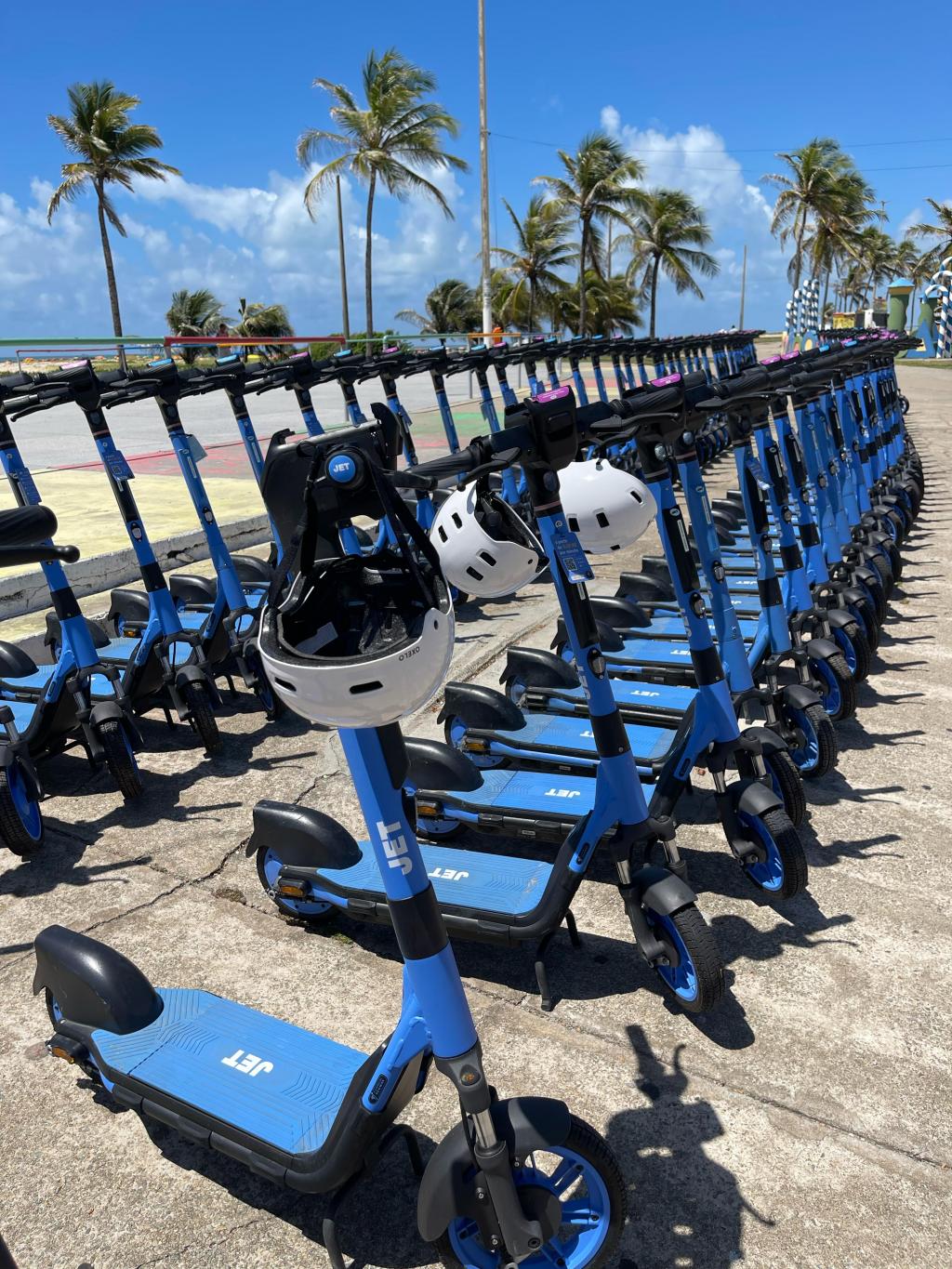 Os patinetes foram trazidos pela empresa Jet, que está fazendo a entrega em duas etapas. Ao todo, serão 600 equipamentos, e neste primeiro momento, 300 já foram instalados.