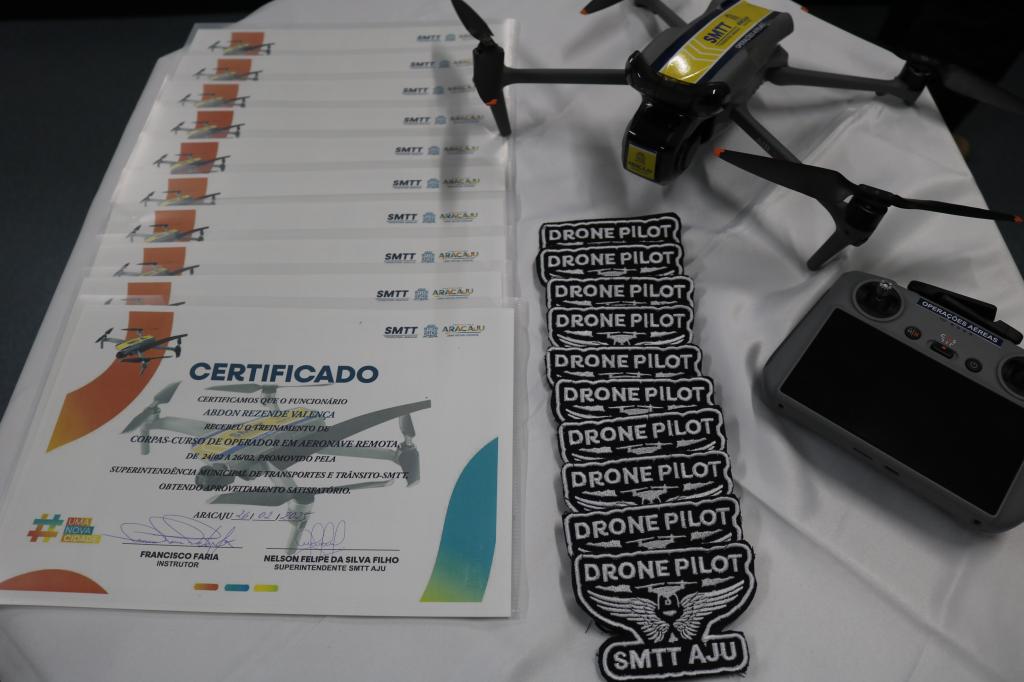 Servidores da Superintendência Municipal de Transportes e Trânsito (SMTT) de Aracaju que participaram do curso de Operador em Aeronave Remota, realizado no mês de fevereiro, receberam nesta quarta-feira, 20, os certificados de conclusão e o brevê que os habilita a operar aeronaves remotas. Esta foi a primeira turma a concluir o curso, marcando um avanço significativo na modernização do serviço.