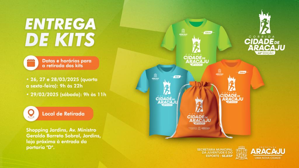 A Prefeitura de Aracaju, por meio da Secretaria da Juventude e do Esporte (Sejesp), realiza entre os dias 26 e 29 de março, no Shopping Jardins, a entrega dos kits para a 40ª Corrida Cidade de Aracaju. Cerca de 10 mil atletas estão confirmados para a edição 2025.
