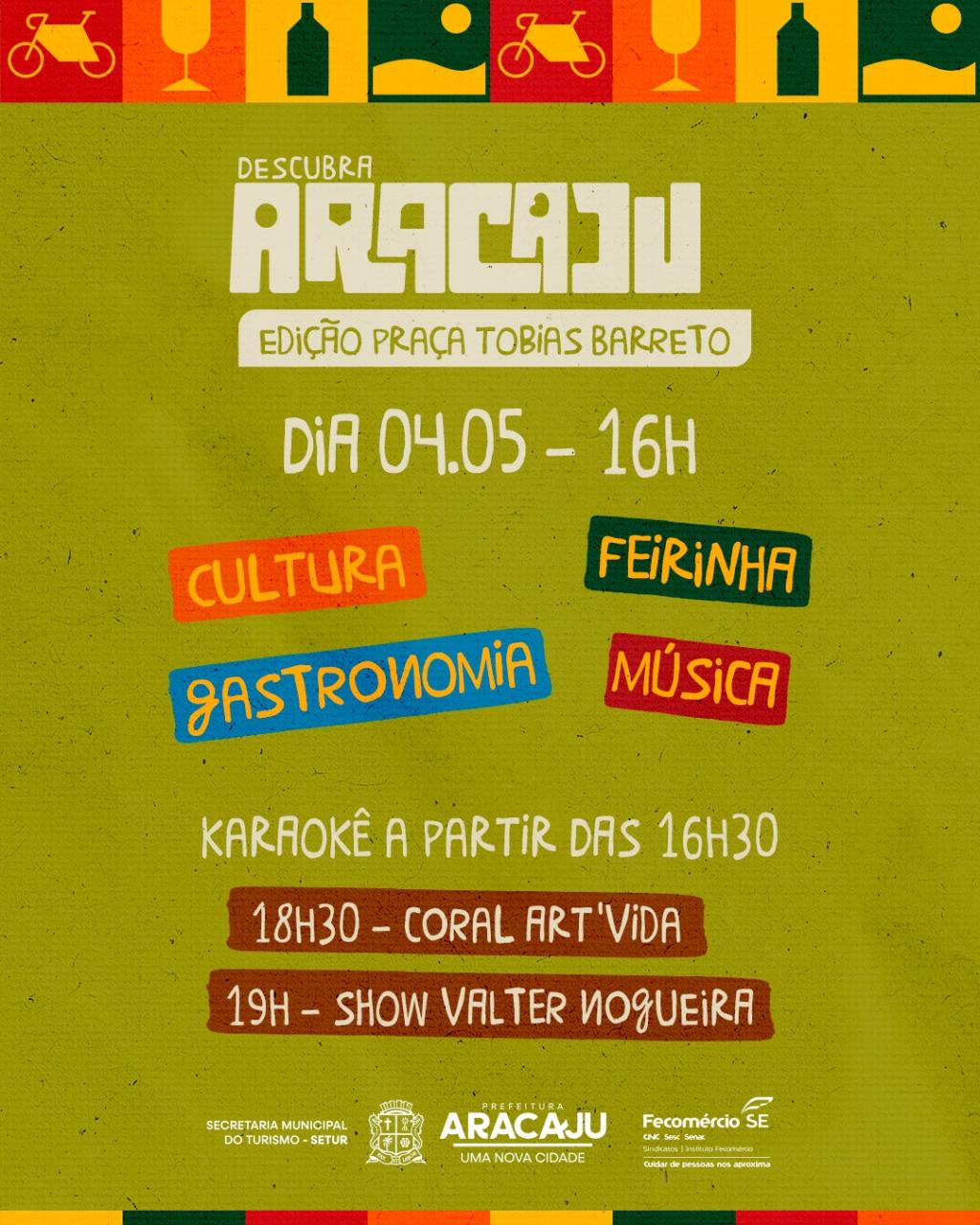 O mês de maio tem início com a realização de três edições do projeto permanente “Descubra Aracaju”: Mirando as Artes, Orla Pôr do Sol e Praça Tobias Barreto. A iniciativa torna-se possível graças a um termo de fomento firmado entre a Prefeitura de Aracaju, por meio da Secretaria Municipal do Turismo (Setur), e a Federação do Comércio de Bens, Serviços e Turismo do Estado de Sergipe (Fecomércio-SE). Confira a programação completa: