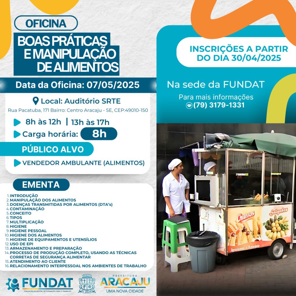 Com o objetivo de qualificar e orientar os vendedores ambulantes de alimentos, a Fundação Municipal de Formação para o Trabalho (Fundat) realiza no próximo dia 7 de maio a oficina de Boas Práticas e Manipulação de Alimentos.