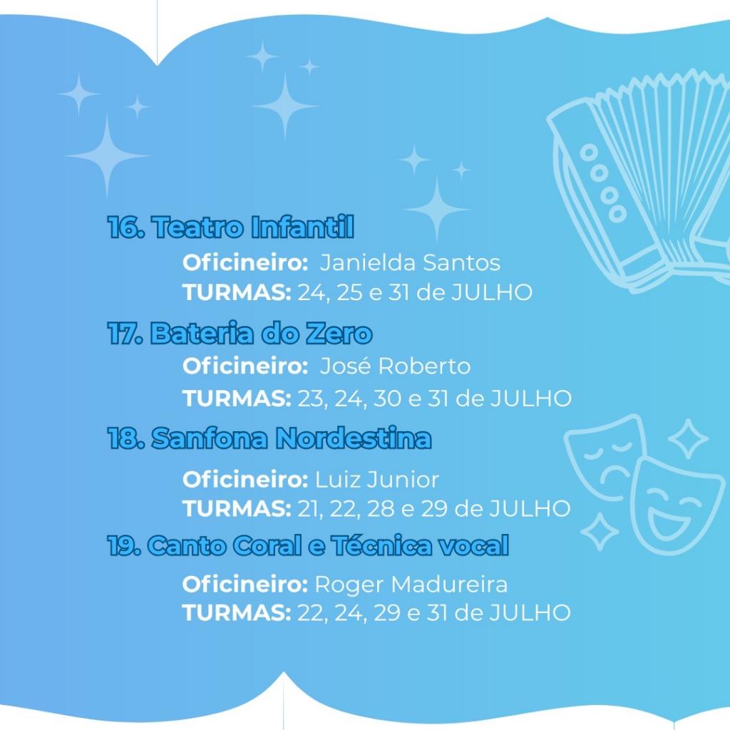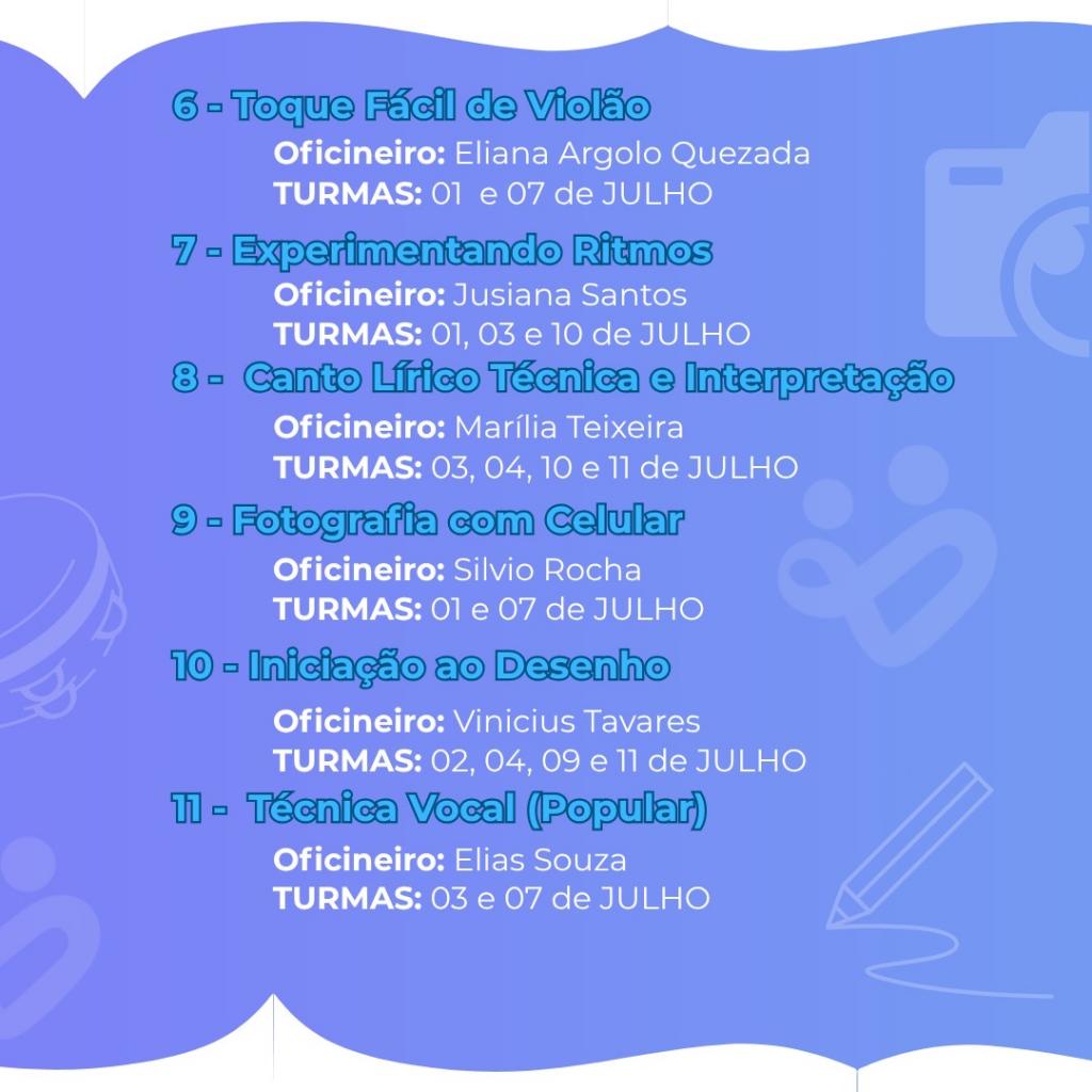 As oficinas são gratuitas e abertas ao público interno e externo, com atividades nas áreas de canto, dança, música, teatro e artes visuais. O número de vagas será definido de acordo com a demanda de inscritos.