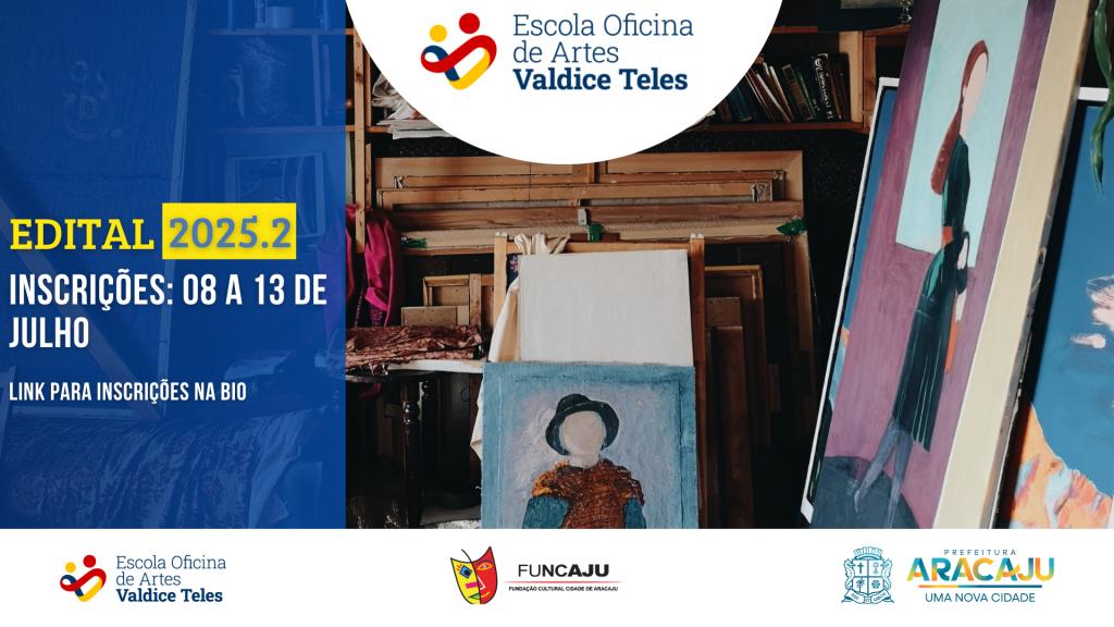 A Escola Oficina de Artes Valdice Teles, vinculada à Fundação Cultural Cidade de Aracaju (Funcaju), torna público o Edital Nº 09/2025 para o segundo semestre de 2025. Estão sendo ofertadas 995 vagas gratuitas em cursos e oficinas nas áreas de artes visuais (desenho, pintura e fotografia), música e dança. As inscrições seguem abertas até o dia 13 de julho.