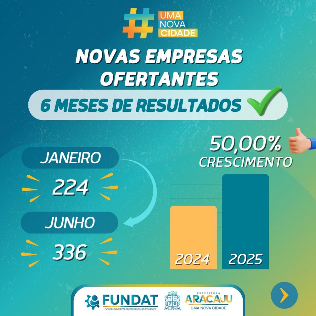 A Prefeitura de Aracaju, por meio da Fundação Municipal de Formação para o Trabalho (Fundat), registrou um crescimento expressivo das ações no primeiro semestre de 2025. O destaque vai para o aumento de 408% no número de vagas captadas em ampla concorrência, em comparação ao mesmo período do ano anterior. Enquanto no primeiro semestre do ano passado foram ofertadas 272 vagas, em 2025 esse número saltou para 1.383.