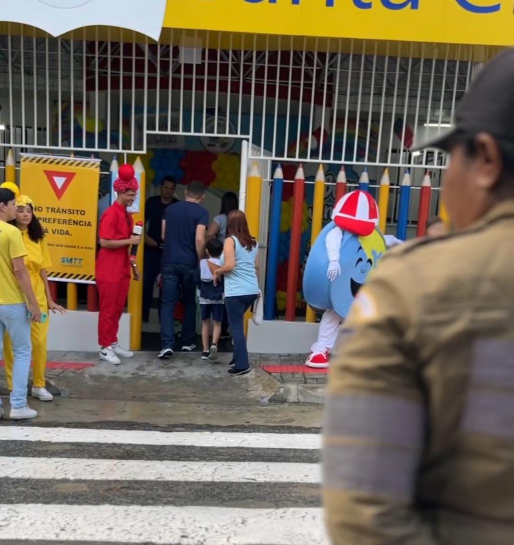 Logo antes das aulas começarem, na chegada dos alunos, a equipe do Grupo Cones de Teatro fez uma interação com os alunos e pais que iam chegando à escola. Abordando as crianças de maneira lúdica, os atores recepcionaram os estudantes e passaram orientações importantes, como a necessidade de atravessar na faixa de pedestres, o uso de cinto de segurança, entre outras recomendações.