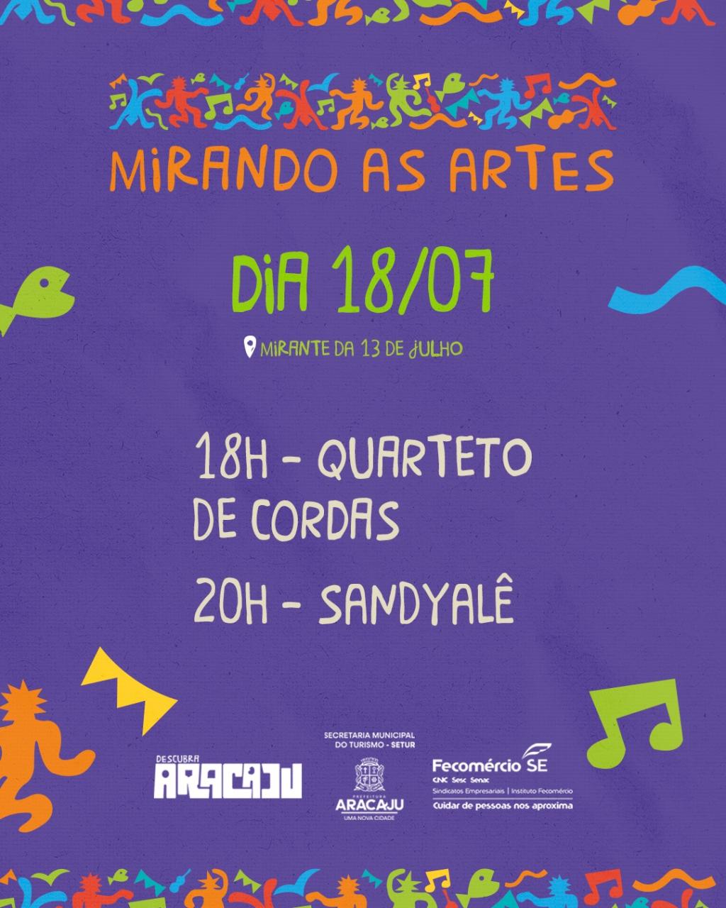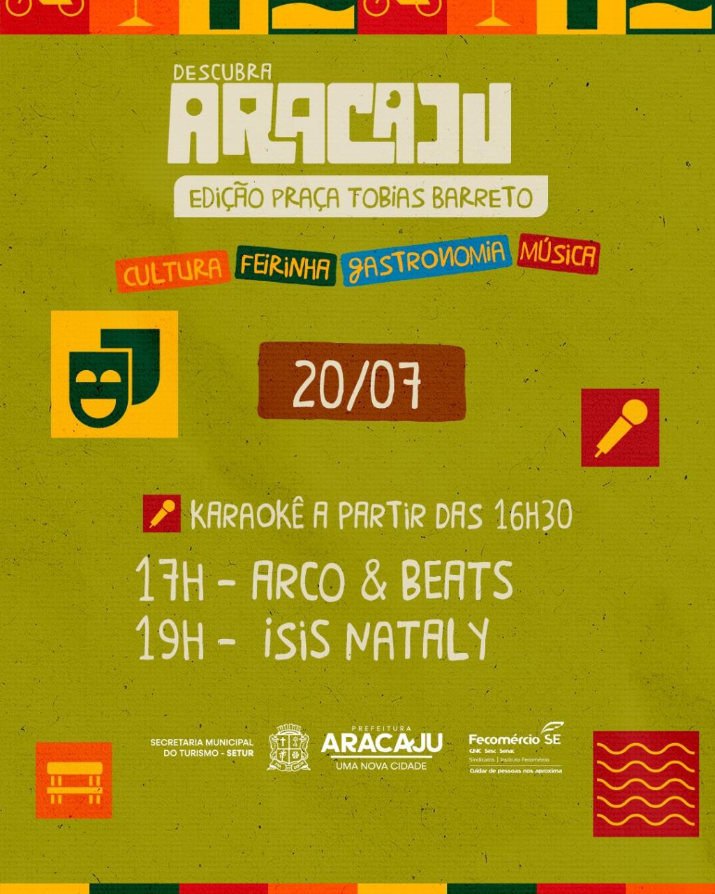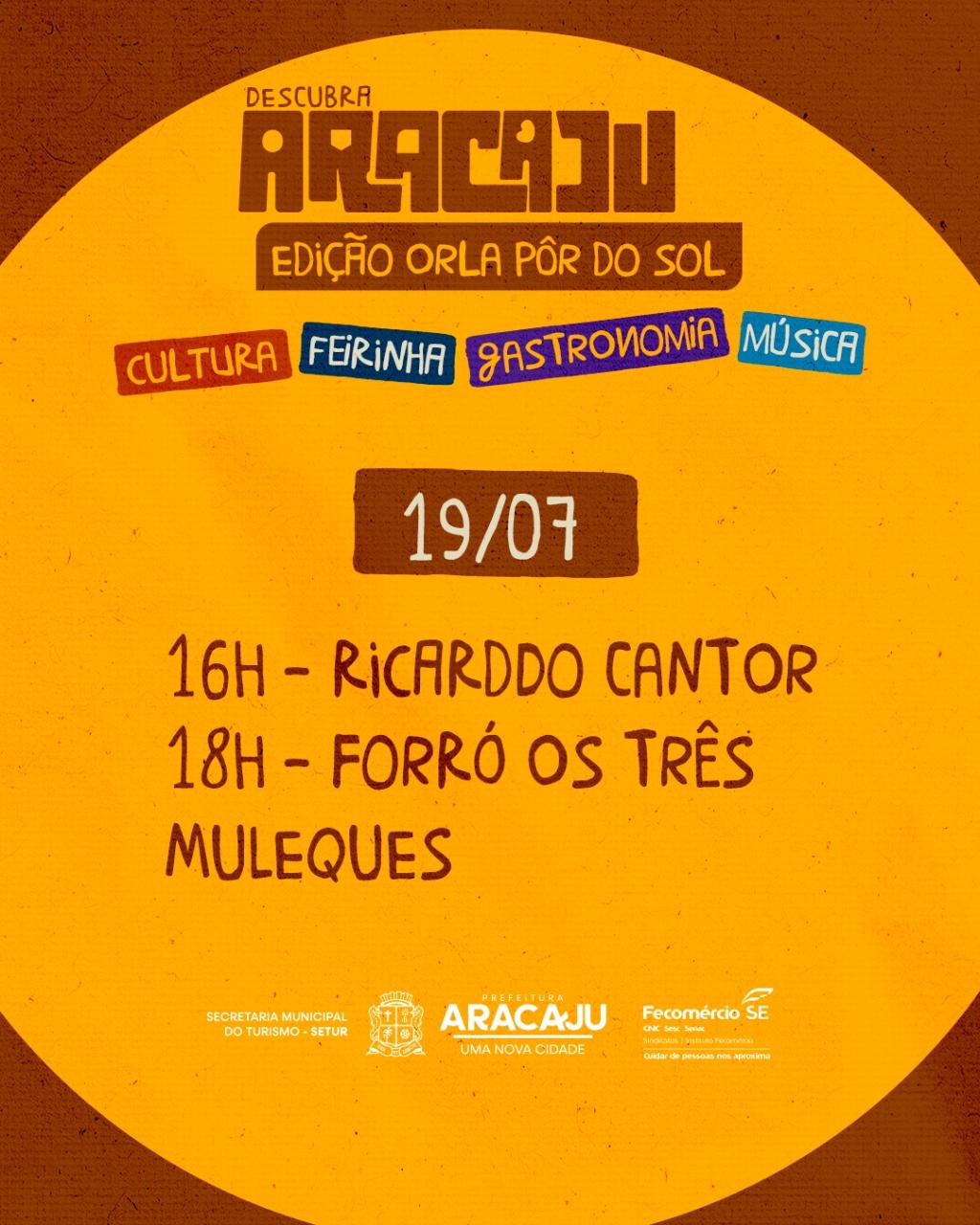 O mês de julho segue com a realização de mais três edições do projeto permanente “Descubra Aracaju”: Mirando as Artes, Orla Pôr do Sol e Praça Tobias Barreto. A iniciativa torna-se possível graças a um termo de fomento firmado entre a Prefeitura de Aracaju, por meio da Secretaria Municipal do Turismo (Setur), e a Federação do Comércio de Bens, Serviços e Turismo do Estado de Sergipe (Fecomércio-SE). Confira a programação completa: