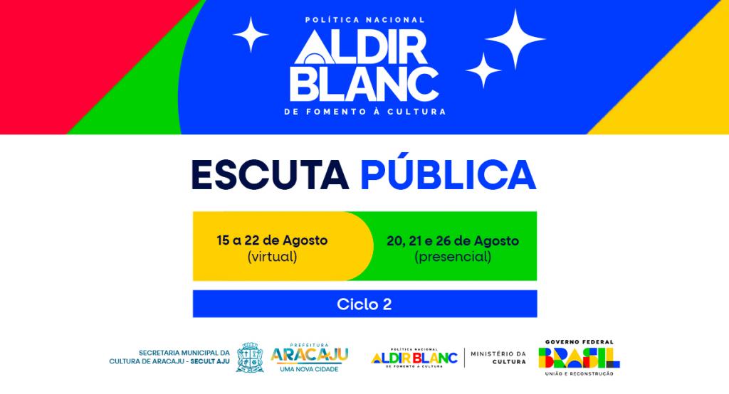 A Secretaria Municipal da Cultura de Aracaju (Secult Aju) convida todos os agentes culturais e fazedores de cultura da capital sergipana para participar das escutas públicas que serão realizadas nos próximos dias 20 e 21 de agosto. Essas escutas fazem parte da elaboração dos editais da Política Nacional Aldir Blanc (PNAB), que destina recursos para o fomento à cultura no Brasil.