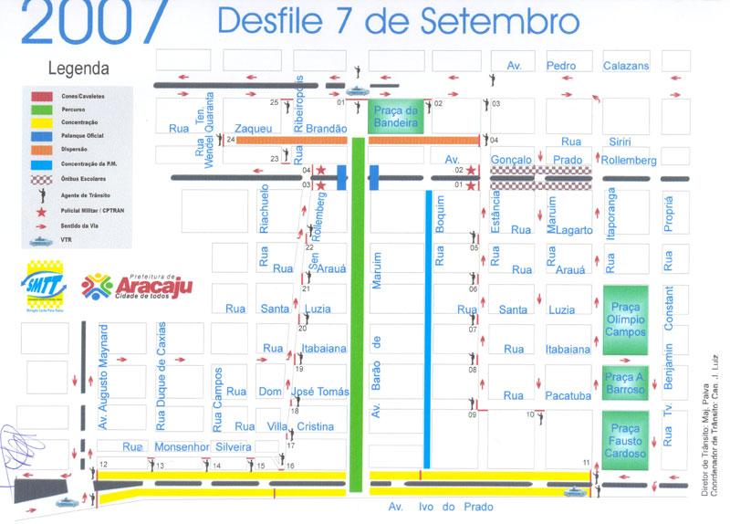 Como já é costume no tradicional desfile cívico do feriado de 7 de setembro, a Superintendência Municipal de Transportes e Trânsito (SMTT) dará todo o apoio ao evento, organizando e fazendo a segurança do trânsito na avenida Barão de Maruim, palco do desfile anual, e também nas vias adjacentes. Serão 40 agentes de trânsito atuando para garantir a tranqüilidade dos participantes e do público. A partir das 6h30 da manhã de sexta-feira, a avenida Barão de Maruim será totalmente interditada. Não ficará nenhum veículo estacionado, para que a via fique totalmente livre para o desfile, informou o superintendente municipal de transporte e trânsito, Antônio Samarone. Alterações no trânsito O tráfego algumas vias sofrerá alteração no dia do desfile. O fluxo de veículos da avenida Barão de Maruim, no sentido Norte-Sul, será desviado para a praça Fausto Cardoso, seguindo pela travessa José de Faro e saindo pela Pedro Calazans. Já no sentido Sul-Norte, o fluxo será desviado para a avenida Augusto Maynard. Na avenida Desembargador Maynard, o fluxo será transferido no sentido Leste-Oeste, para a avenida Hermes Fontes.