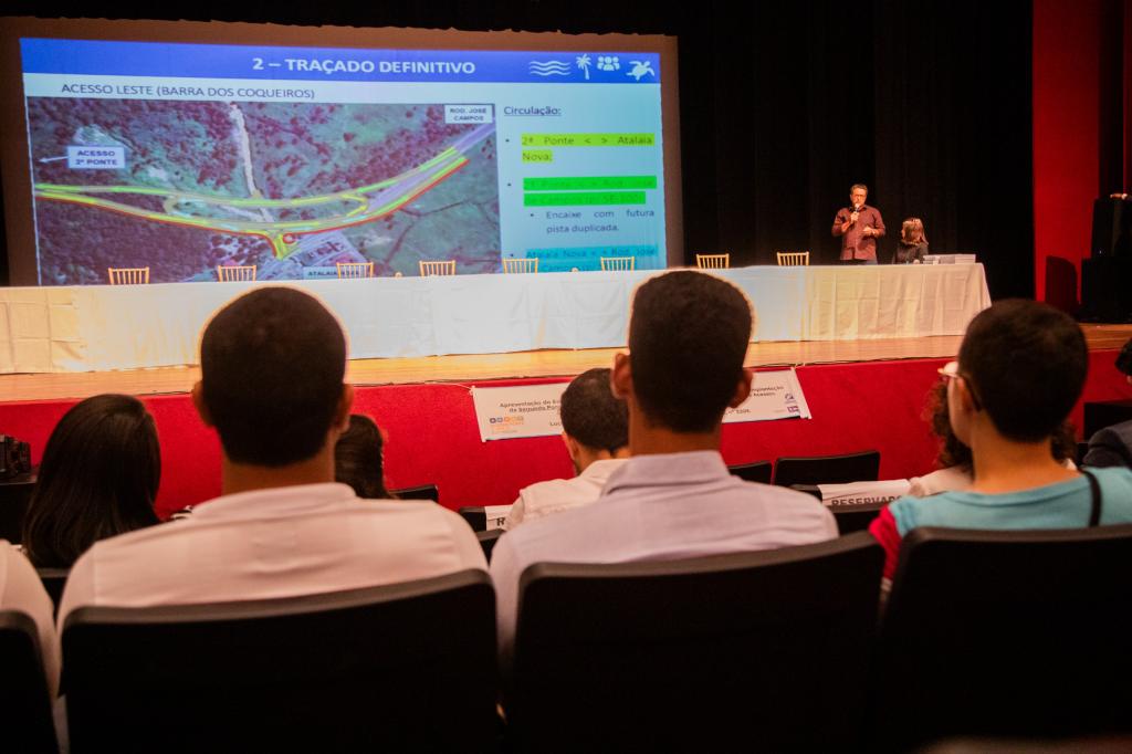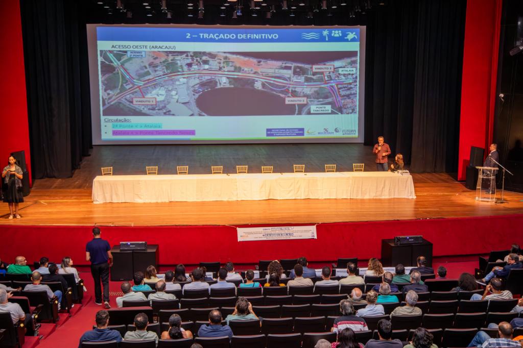 A Prefeitura de Aracaju, representada pela Secretaria Municipal do Planejamento, Orçamento e Gestão (Seplog) e pela Secretaria Municipal do Meio Ambiente (Sema), participou, nesta segunda-feira, 01, da segunda audiência pública promovida pelo Governo de Sergipe sobre a construção da nova ponte que ligará Aracaju à Barra dos Coqueiros. Realizado no Teatro Tobias Barreto, o encontro teve como objetivo detalhar aspectos técnicos, sociais e ambientais do projeto, além de ouvir a população sobre os impactos e benefícios da obra. A secretária municipal do Meio Ambiente, Emília Golzio também acompanhou a audiência.