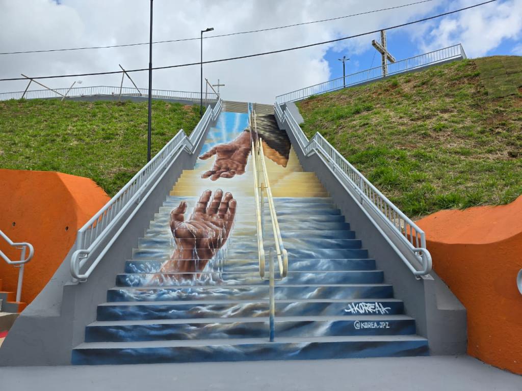 A escadaria que liga a praça à igreja também se tornou símbolo da revitalização. Antes simples, hoje é acessível, artística e transformada em cenário fotográfico. A intervenção recebeu pinturas do artista Korea JPZ, conhecido pela escadaria do Recanto da Jaqueira, que trouxe novamente sua assinatura a um espaço urbano de grande significado. Junto a ele, o grafiteiro André Chagas foi responsável por boa parte das artes do local.