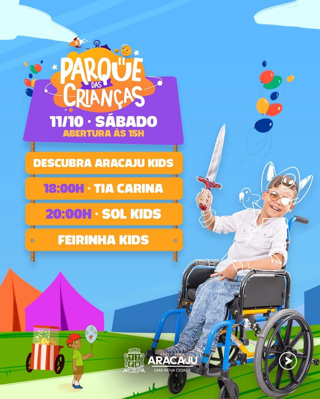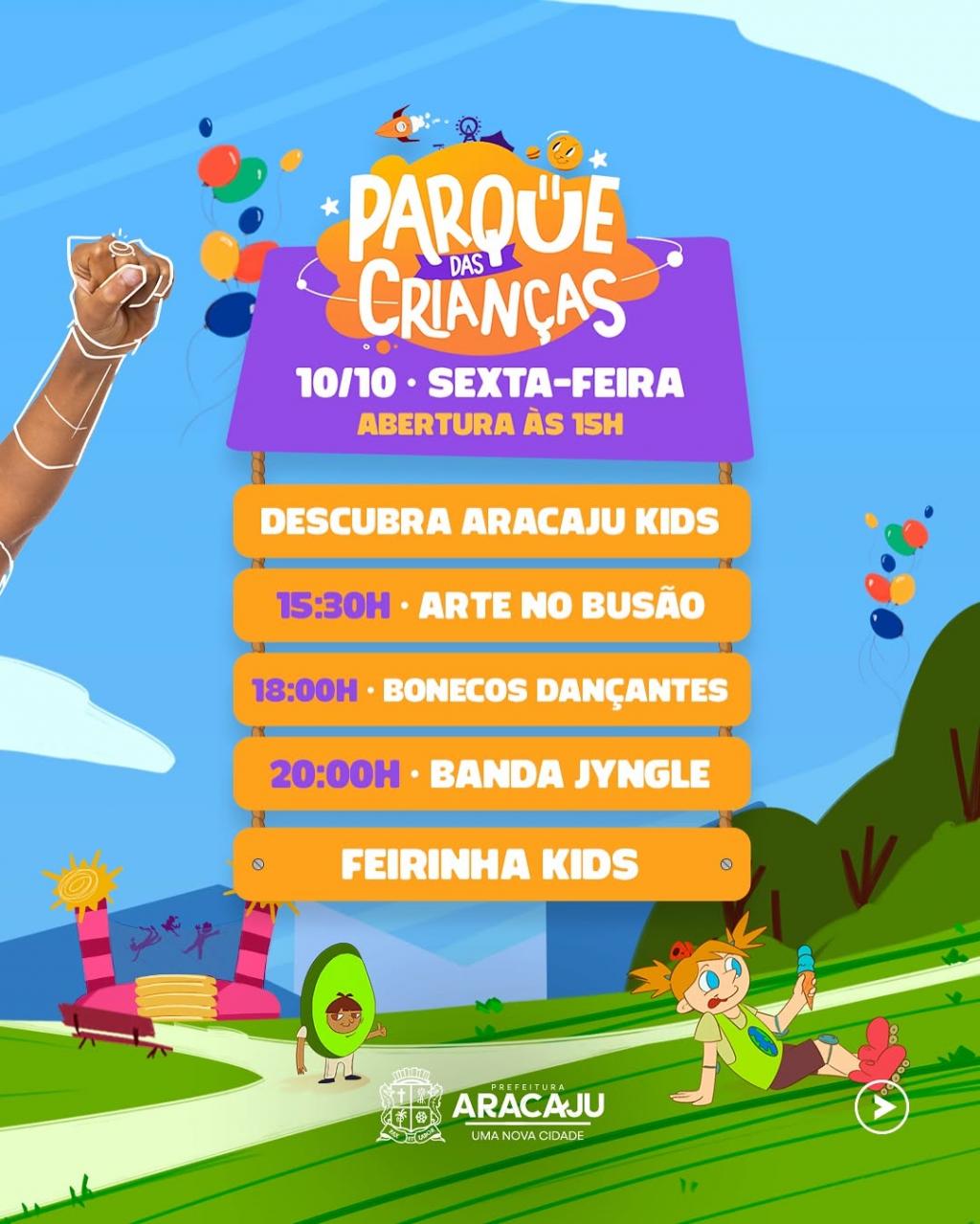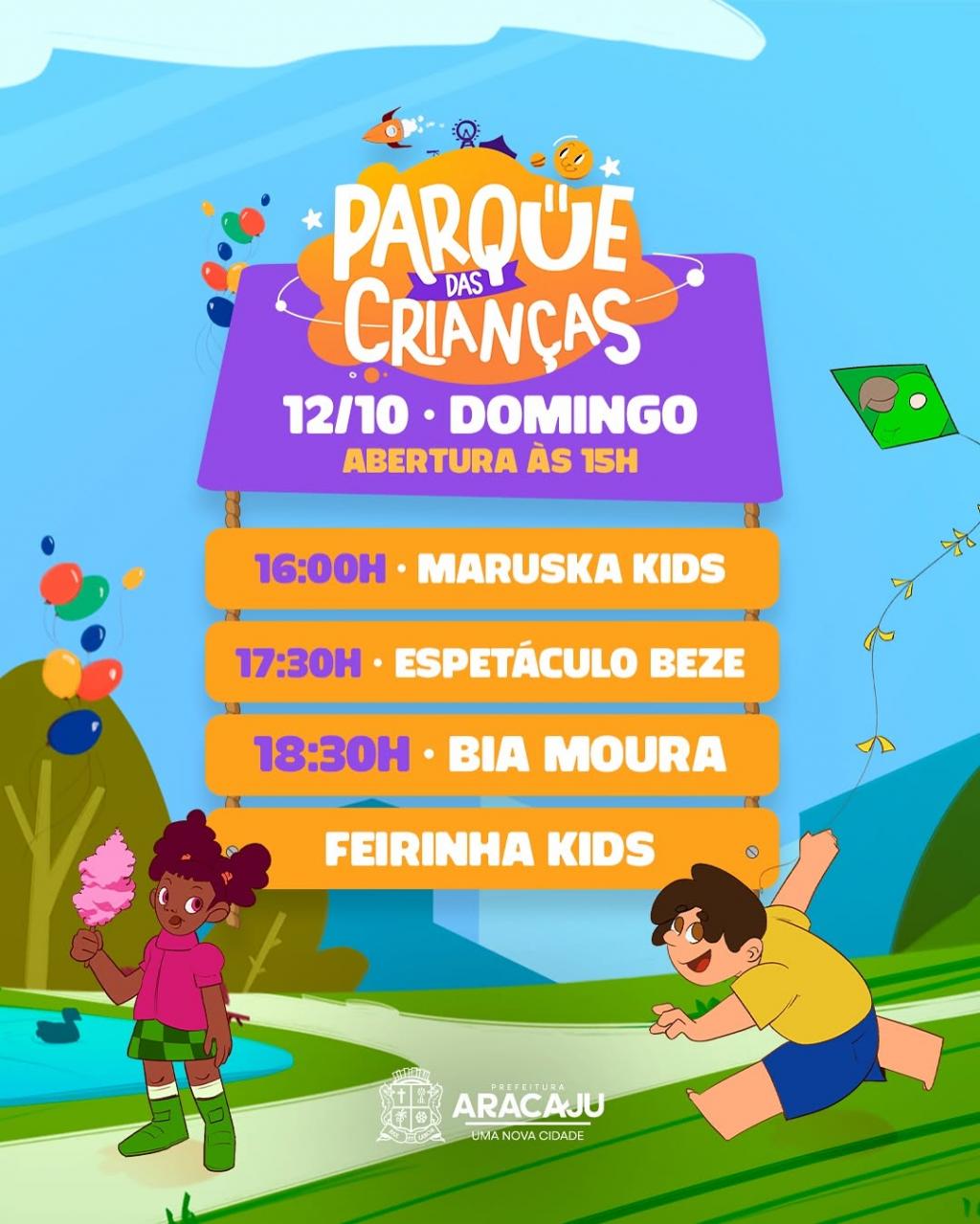 A Prefeitura de Aracaju preparou uma programação especial para celebrar o Dia das Crianças. Após a inauguração da reforma do Parque Governador Augusto Franco (Parque da Sementeira), a prefeita Emília Corrêa dará início, nesta sexta-feira, 10, às atividades do evento Parque das Crianças com uma série de atrações voltadas ao público infantil. A programação se estende até o dia 12 de outubro, sempre a partir das 15h, no Parque Governador Augusto Franco (Parque da Sementeira).