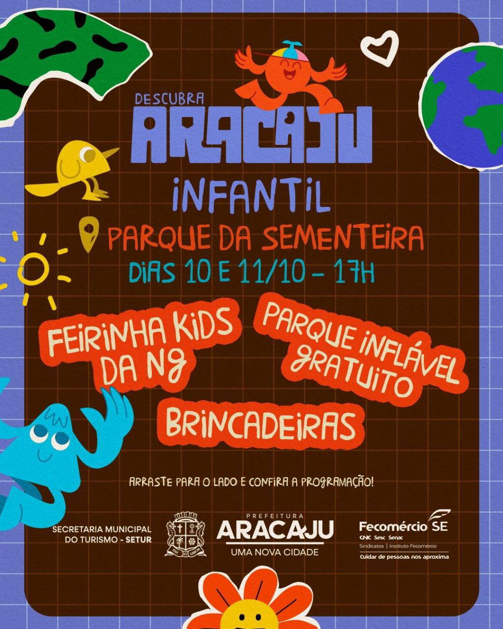 Além das edições tradicionais Mirando as Artes e Praça Tobias Barreto, o projeto Descubra Aracaju terá, neste fim de semana do Dia das Crianças, uma programação totalmente voltada para o público infantil. O Descubra Aracaju Infantil acontece nos dias 10 e 11 de outubro, a partir das 17h, no Parque Governador Augusto Franco, conhecido como Parque da Sementeira.