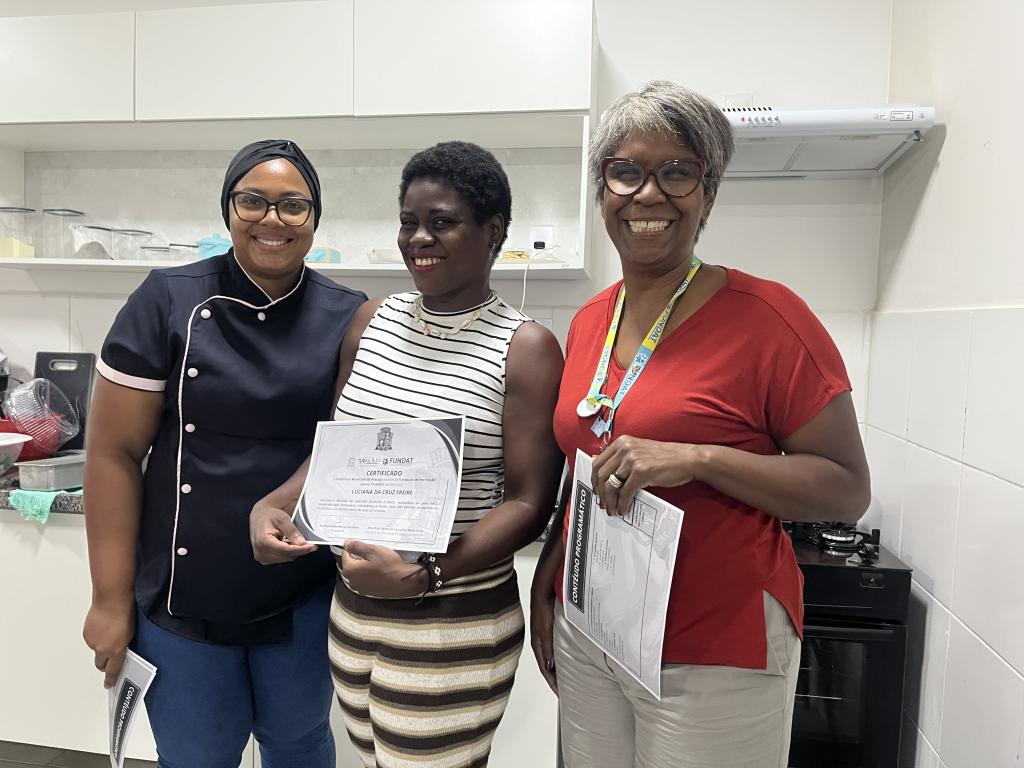 A aluna Luciana da Cruz, participante da Oficina de Lanches Quentes e Frios, celebrou o aprendizado: “Eu acabo de completar meu curso de Lanches Quentes e Frios aqui no GACC, com a Fundat. Estou muito animada, gosto bastante de cozinhar. Aprendi muito em três dias, foi muito interessante. A carga horária me surpreendeu, aprendi bastante e quero aplicar tudo isso na minha vida profissional e pessoal, diariamente.”