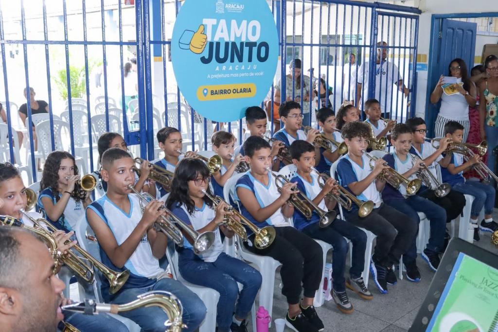 Um dos diferenciais desta edição do Tamo Junto foi que alunos da rede de Aracaju foram protagonistas em diversas ações. Na abertura do evento, logo na entrada da escola, a apresentação da banda marcial da Oviêdo Teixeira chamou atenção do público pela beleza e qualidade musical. Mayra Bittencourt é mãe de dois estudantes que se apresentaram na ocasião, Nicolly Beatriz e Nicollas Pietro. A mãe descreveu a experiência de ver suas crianças tocando para a comunidade como maravilhosa, fruto de um projeto musical desenvolvido na escola.