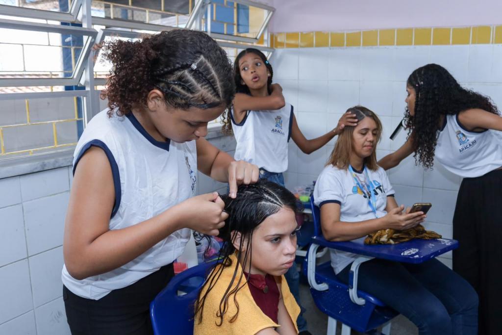 Os estudantes da Escola José Conrado de Araújo ministraram a Oficina de Tranças. Representando o grupo, a aluna do 7º ano Evelin Jason expressou o quanto foi significativo participar de uma ação cujo foco foi um dos símbolos de resistência, da cultura, beleza e história do povo negro. “Estamos aqui fazendo vários tipos de tranças nas pessoas, e dando prioridade aos alunos dessa escola (Oviêdo Teixeira)”, contou.