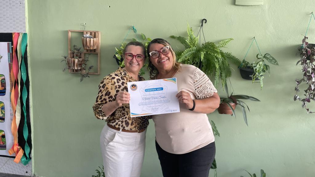 A entrega do Selo é um desdobramento do ‘Programa Horas de Estudo’, com foco na capacitação continuada de docentes, por meio do qual as professoras Jackeline Fonseca e Nildete Vieira apresentaram o Projeto ‘Brincando e Convivendo’, uma ação de viés educativo que tem gerado resultados satisfatórios com as crianças de 3 a 5 anos atendidas no Santa Maria. Pela inclusão do projeto na rotina escolar e compartilhar informações com técnicos da Semed e professores da rede, as profissionais receberam certificados na ocasião.
