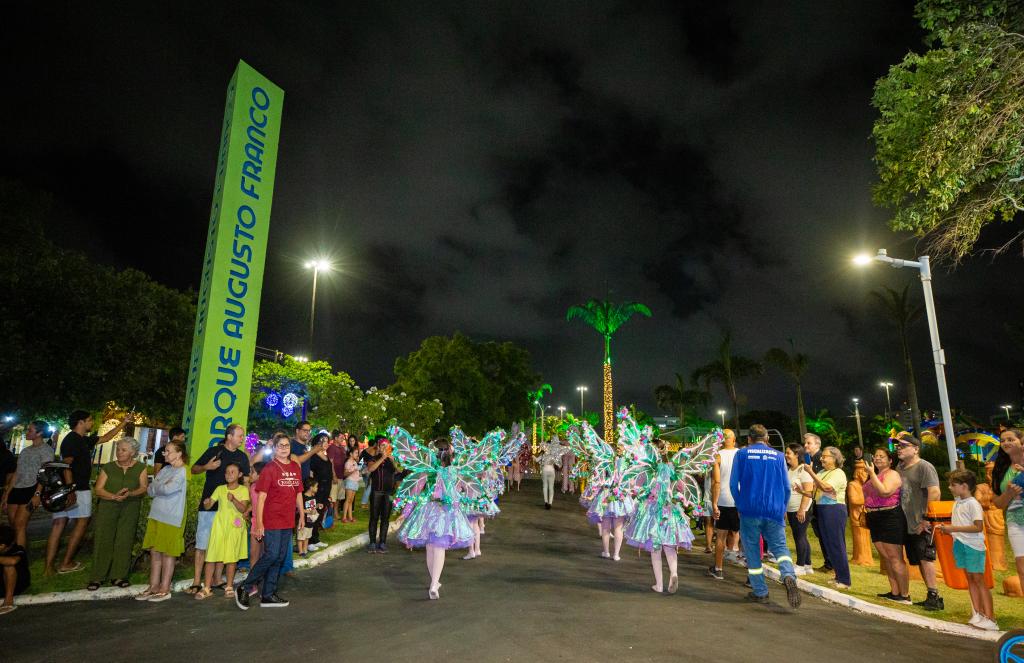 Entre as famílias que descobriram a programação ao chegar ao parque, a fotógrafa Karine Oliveira se destacou pela empolgação. Ela levou a mãe, o marido e até a cachorrinha para vivenciar o momento. “A gente não sabia que ia ter esse desfile. Quando chegamos aqui, uma moça falou do desfile e surpreendeu. Foi lindo! A última vez que a gente viu foi na Orla. Está lindo demais. Trouxe as crianças para ver o parque e está super aprovado. A iluminação está perfeita, perfeita demais”, afirmou.