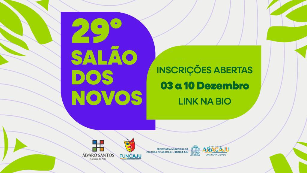 A Prefeitura de Aracaju, por meio da Fundação Cultural Cidade de Aracaju (Funcaju) e da Galeria de Arte Álvaro Santos (GAAS), abriu as inscrições para o 29º Salão dos Novos, que acontece entre os dias 3 e 10 de dezembro. As inscrições devem ser realizadas por meio de formulário online disponível no Mapa Cultural de Aracaju e nas redes sociais da Funcaju.