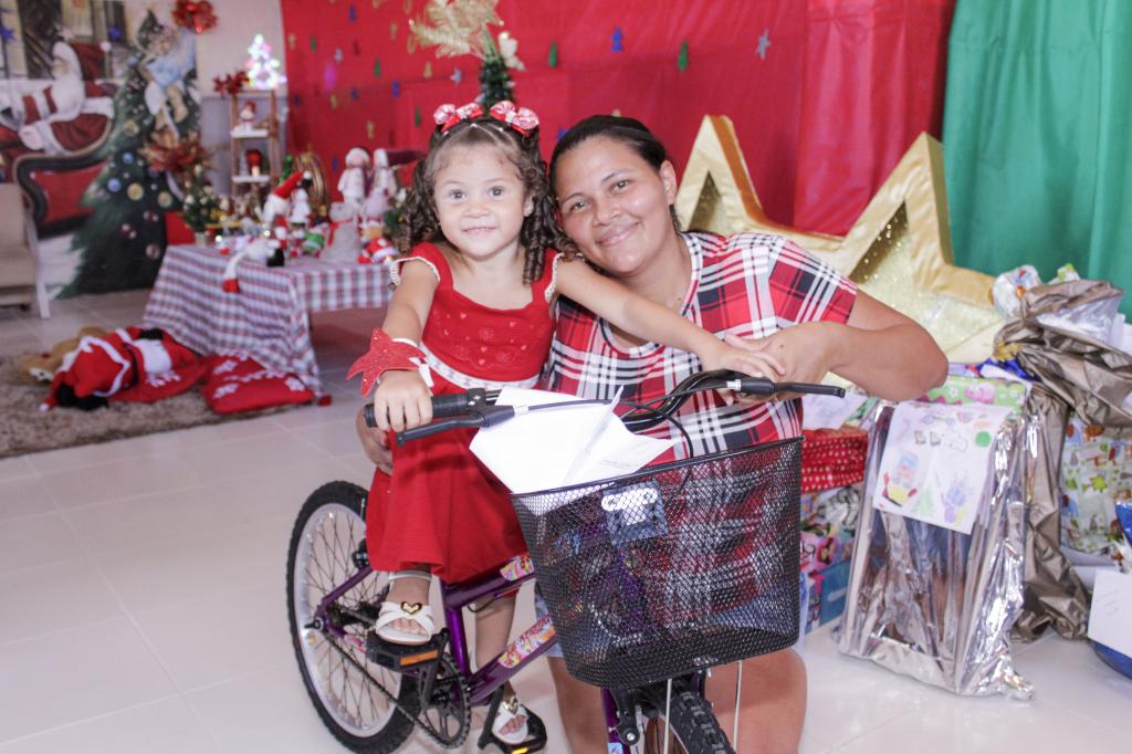 Ana Muniz, de 4 anos, foi contemplada com uma bicicleta e comemorou muito o presente de Natal que ganhou. Segundo a mãe dela, Tainá Muniz, era algo muito esperado pela menina. “Era o sonho dela ganhar a bicicleta. Quando a professora dela, Tia Edna, disse que ia ter a cartinha dos Correios, ela pediu a bicicleta. Graças à Semed e a colaboração de todos, o sonho dela foi realizado. Agora, ela vai poder brincar muito e curtir o brinquedo novo. Muito obrigado”, agradeceu Tainá Muniz.