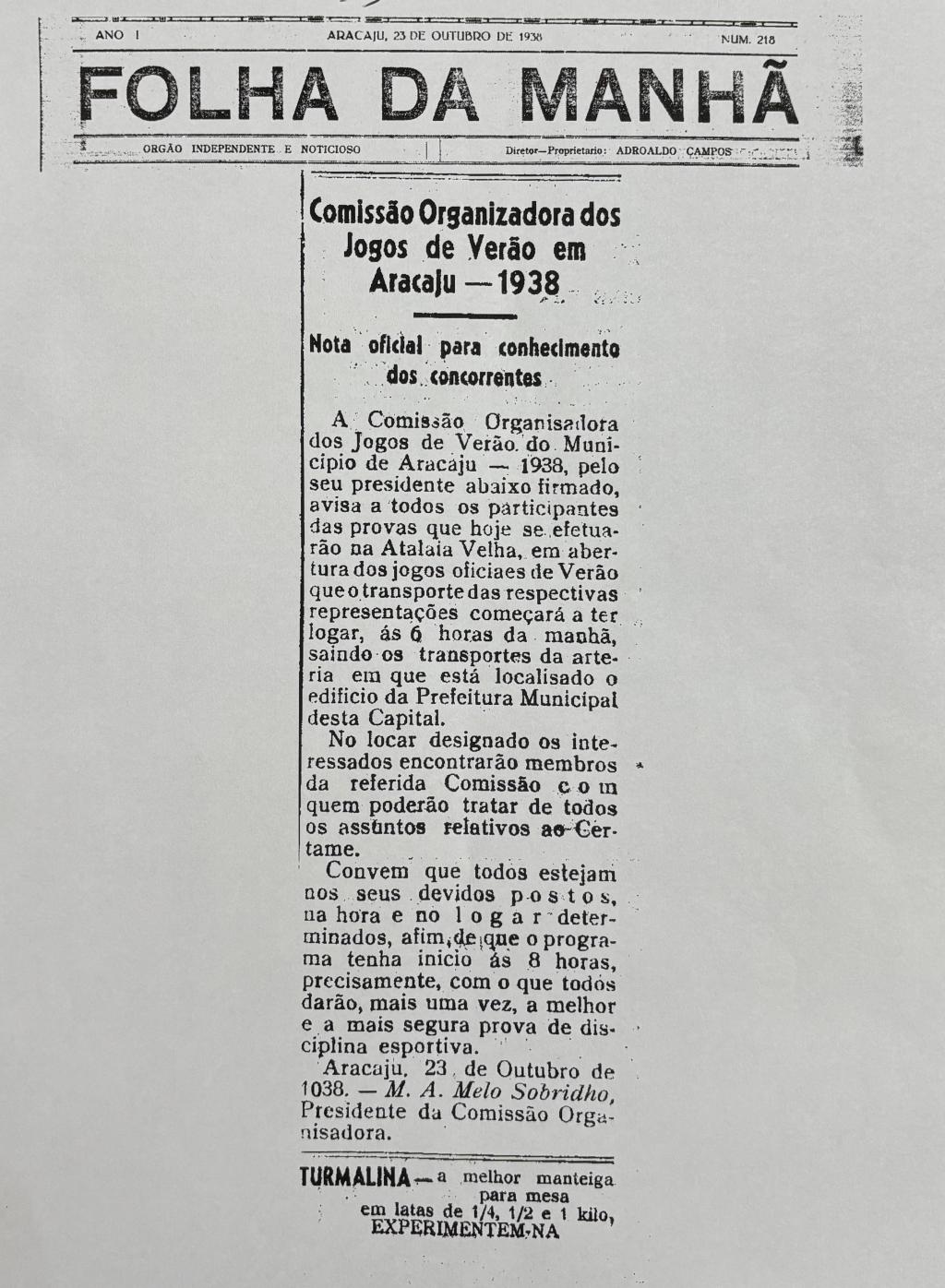 Os Jogos de Verão representam umas das competições esportivas mais antigas de Aracaju. A primeira edição ocorreu em 1938, conforme publicação do jornal Folha da Manhã de 23 de outubro daquele ano. A disputa aconteceu na Praia da Barreta na Atalaia Velha, em frente ao Palácio de Veraneio, um local de fácil acesso para os desportistas da época. O prefeito era Godofredo Diniz e foram disputadas seis modalidades, entre elas remo e atletismo, tradicionais daquele período. Em 1939, ocorreu a segunda edição do evento e ao longo dos anos outras competições foram realizadas com as mesmas características. A edição 2026 acontece neste fim de semana com 800 atletas inscritos em 10 esportes, na Praia da Cinelândia.