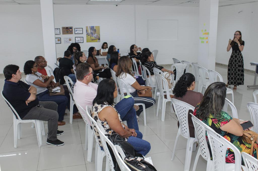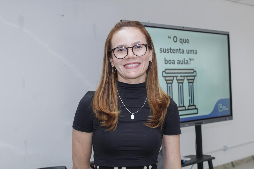 A formadora da Associação Bem Comum, Emanuele Gomes, apresentou a sistematização de práticas pedagógicas e os pilares de uma boa docência, entre outros conteúdos, para desenvolver uma liderança escolar voltada para os alunos em acompanhamento dos professores. “Se o diretor escolar começa a olhar para o seu trabalho de acompanhamento, não só da parte burocrática de liderança, mas para a parte pedagógica, isso vai colaborar para que a aprendizagem seja qualificada. O diretor vai participar da escola como um todo, não só o coordenador, não só o professor, mas ele também vai fazer parte da qualificação da aprendizagem”, explica.
