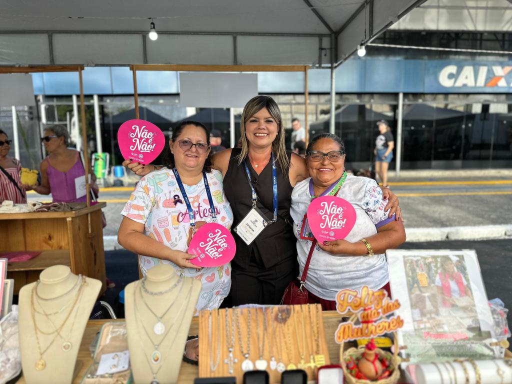 Além da participação das empreendedoras, a equipe da SerMulher esteve reforçando a campanha “Não é não”, com a distribuição de leques e colocação de tatuagens temporárias.