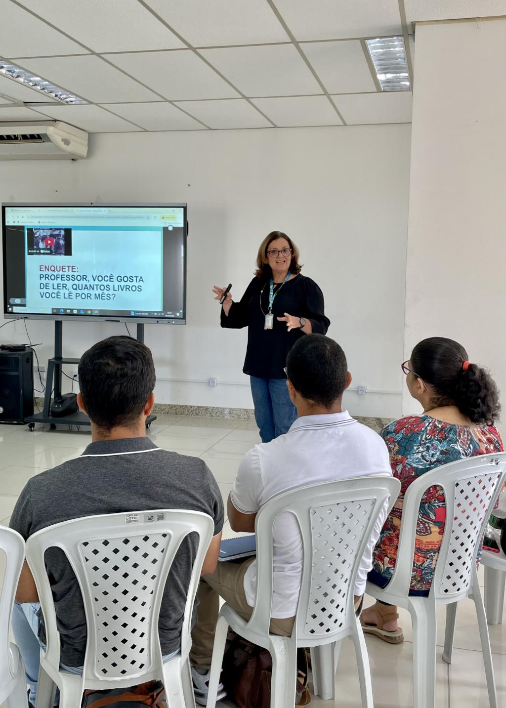 A formação de hoje é ministrada nos dois turnos pela professora de Língua Portuguesa e coordenadora do Programa Escola em Tempo Integral da Semed, Roberta Martins. Na ocasião, ela abordou pontos pertinentes aos campos artístico-literário, jornalístico-midiático e leitura literária, e a importância da aplicação de textos dessa natureza nas atividades educacionais. Com isso, a formadora reforça aos professores da rede a relevância de desenvolver estratégias de leitura para estimular as competências leitora e comunicativa, o pensamento crítico e habilidades socioemocionais nos estudantes.
