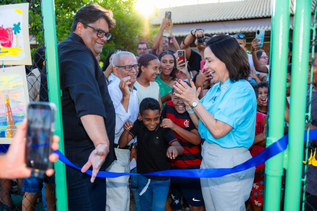 Quem também não disfarçou o entusiasmo, foi a pequena Mellody Sophia, assistida pelo Projeto Esperança. “Agora a gente tem um lugar de verdade só pra gente brincar, correr, pular e se divertir. Antes, tínhamos que improvisar. Eu gostei muito da quadra, tá linda! Dá pra jogar bola, fazer atividades e ficar junto todo mundo. Eu tô muito feliz, porque esse espaço é nosso, é das crianças, e a gente vai cuidar direitinho”, concluiu.