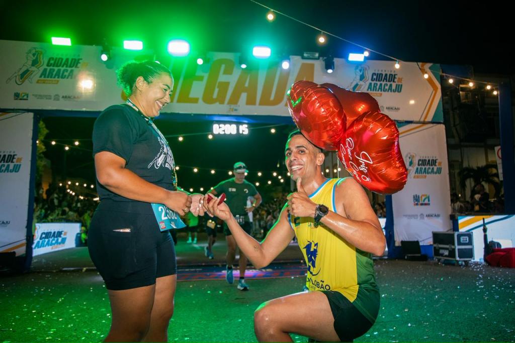 A linha de chegada da 41ª Corrida Cidade de Aracaju foi palco de um momento que ultrapassou o esporte. Após completar os 10 quilômetros da prova, a fisioterapeuta Iris Alane, de 32 anos, foi surpreendida com um pedido de casamento feito pelo atleta Bruno Lobão, que havia acabado de concluir o percurso de 24 quilômetros.