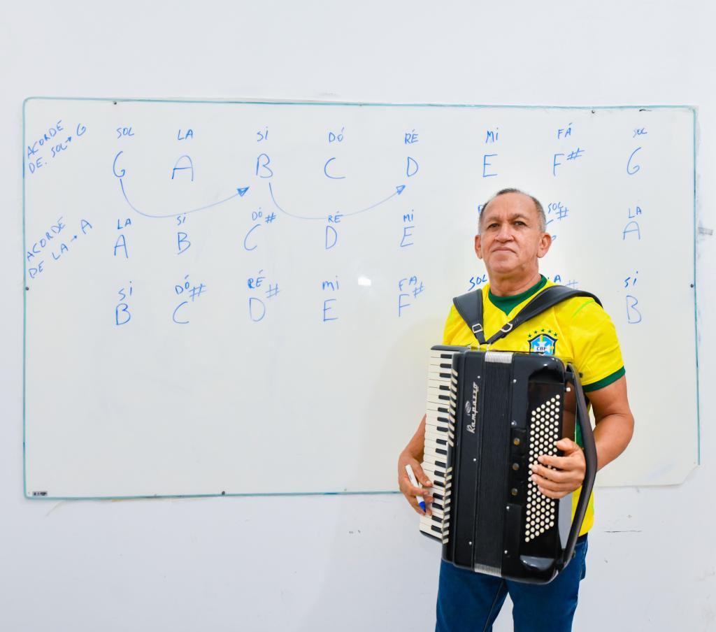 Aluno de Júnior, Júlio Silva, de 61 anos, contou que sempre teve interesse em aprender a tocar algum instrumento. Durante a adolescência tentou aprender violão sozinho, mas acabou desistindo, o que gerou um distanciamento da música, que foi aprofundado quando chegou a vida adulta com a rotina de trabalho. Júlio conta que, agora após se aposentar, buscou a Valdice Teles para iniciar seu antigo hobby. “Agora com a aposentadoria tenho mais tempo e vim realizar esses planos de quando eu era jovem. E quando cheguei, escolhi a sanfona, que não sabia de nada, mas aos poucos estou evoluindo e estou gostando muito”. Júlio também aponta que pretende fazer outros cursos após finalizar a oficina de sanfona.