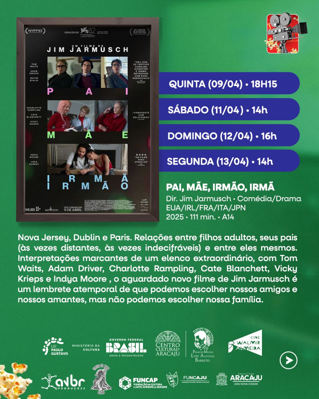 O Cinema Walmir Almeida, localizado no Centro Cultural Palácio-Museu Luiz Antônio Barreto — unidade da Fundação Cultural de Aracaju (Funcaju) — recebe, nesta semana, filmes nacionais e internacionais, entre eles 'Pai, Mãe, Irmão, Irmã'; 'A Cronologia da Água' e o brasileiro 'Ruas da Glória'.