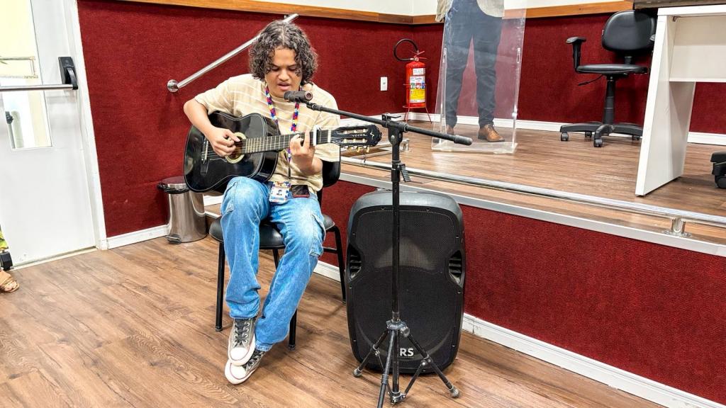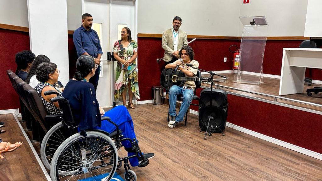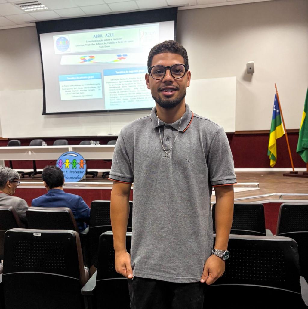 O evento contou com homenagens para pessoas com deficiência na condição do TEA que tem a capacidade de superação e busca ativa sobre suas metas de vida, assumindo a posição de destaque em suas próprias histórias e na sociedade. Um dos homenageados foi o aluno da Educação de Jovens e Adultos (EJA) da Escola Diomedes Santos Silva, Fábio Farias, de 21 anos, que é a única pessoa da EJA em sua unidade escolar que faz parte do Atendimento Educacional Especializado (AEE). “Eu me sinto muito bem estudando na Escola Diomedes. A professora Jacqueline está me ajudando com a minha leitura e escrita. Graças a Deus todos da escola e da minha família estão me apoiando, principalmente a minha tia”, disse o aluno que partilha um sentimento de gratidão e carinho por sua tia que o acompanhou durante a ocasião.