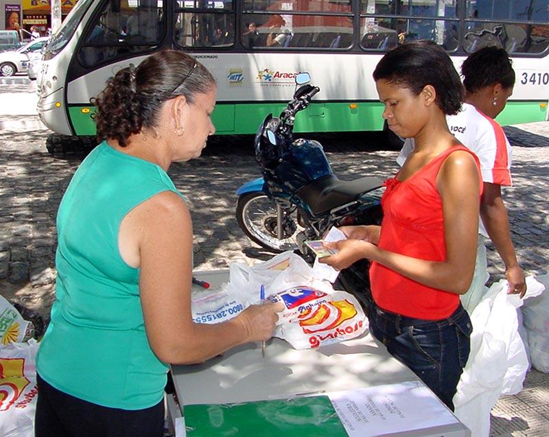 Faltando uma semana para o início do Pré-Caju 2005, os foliões que brincam nas arquibancadas começaram na manhã de hoje, 6, a troca de alimentos por ingressos. A campanha Alegria 100 Fome Zero é uma parceria firmada entre a Secretaria Municipal de Assistência Social e Cidadania (Semasc) e a Associação Sergipana de Blocos e Trios (ASBT). Para maior comodidade da população estão espalhados quatro postos de arrecadação, em diferentes pontos da cidade. Um posto está localizado no Mirante da Praia 13 de Julho e funciona das 12h às 21h, outros dois estão localizados nos shoppings center da cidade e estão abertos das 12h às 22h, e o último posto está situado na Praça General Valadão, funcionando das 08h às 17h. Para cada ingresso que permite acesso às arquibancadas na noite de quinta-feira, o folião deve trocar por três quilos de massa de milho, para a sexta-feira cada ingresso equivale a três quilos de arroz, para o sábado cada ingresso pode ser trocado por três quilos de feijão e para o domingo o ingresso será correspondente a três quilos de açúcar. Além do ingresso, o folião receberá um lencinho com a logomarca dos 150º aniversário de Aracaju. Em seu primeiro dia de funcionamento, o posto de troca da praça General Valadão arrecadou considerável quantia de alimentos. Estamos começando a troca hoje e já arrecadamos bastante alimentos. Acredito que até o fim de semana já tenhamos todos os ingressos trocados, disse entusiasmada a agente administrativa da Semasc, Matilde Soares Bispo. Até o momento a procura pelos dias da festa está sendo bastante equilibrada. Lembrando a população que estamos trabalhando em dois turnos, com quatro funcionários cada, para que o atendimento seja ágil e eficaz, destacou Matilde Soares. Para a foliã e auxiliar de escritório, Ivone Santana, a campanha Alegria 100 Fome Zero é uma ótima oportunidade de ajudar ao próximo e se divertir ao mesmo tempo. Todos os anos brinco o Pré-Caju e acho ótimo essa campanha, onde posso fazer uma boa ação e em troca disso, ainda brinco com tranqüilidade junto a minha família nas arquibancadas. Todos os quatro postos de arrecadação irão funcionar até que se esgotem os ingressos para as arquibancadas do Pré-Caju 2005.