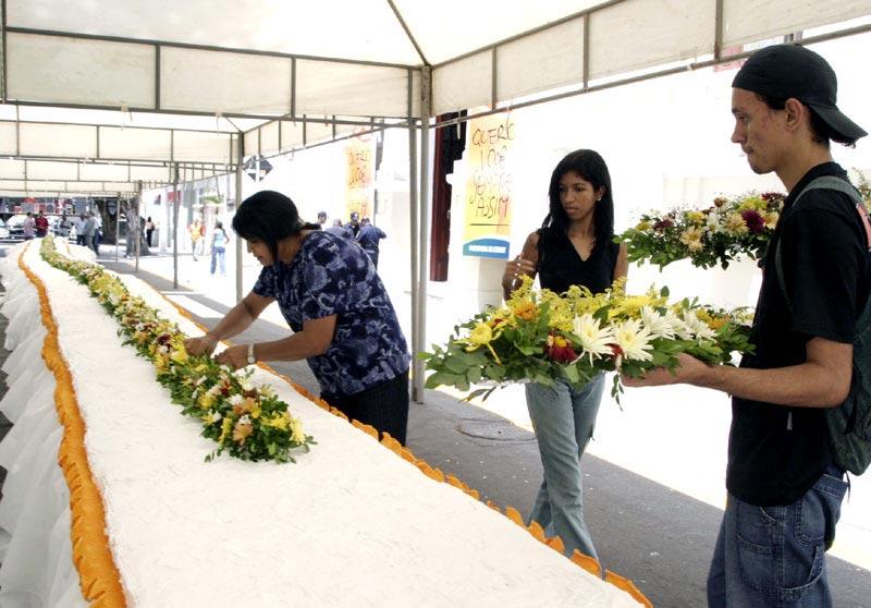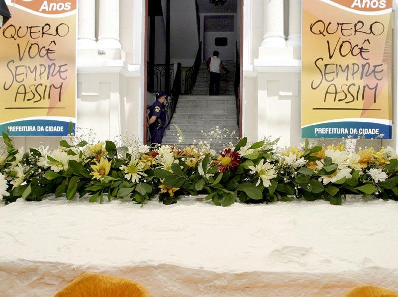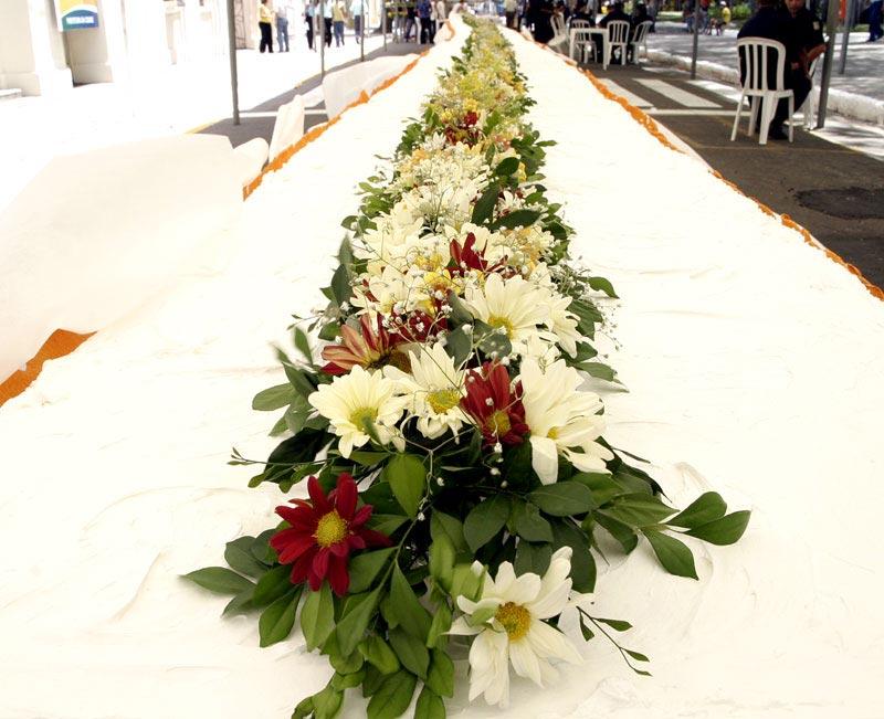 A ansiedade da população aracajuana para que o bolo de 150 metros seja repartido é grande. Recebendo retoques finais, o mega bolo chama atenção de quem passa à frente da sede da prefeitura, onde a guloseima está localizada. A responsável pelo trabalho, Telma Andrade, proprietária do buffet Finesse, diz estar emocionada ao ver o bolo formando os 150 metros, idade de Aracaju a partir de amanhã, 17. Eu estou muito orgulhosa, pois este trabalho foi um desafio para mim, diz. Já trabalhei em eventos semelhantes, mas nada que chegasse a esta proporção. Mas o que importa é que eu e toda equipe conseguimos e estamos muito felizes por estar entrando para a história da cidade, ressalta. Foram utilizados no bolo do sesquicentenário 1.100 quilos de farinha de trigo, mais ou menos 1000 quilos de açúcar, 830 dúzias de ovos, 550 quilos de manteiga e 500 litros de leite. Ao total, 18 pessoas trabalharam na confecção durante quatro dias. Montamos uma verdadeira estrutura. Trabalhamos com vários fornos e batedeiras, enfatiza Telma. Eu sou suspeita em falar, mas modéstia à parte, o bolo está muito bom, frisa. De acordo com Maria Auxiliadora de Jesus Silva, que estava observando as pessoas trabalhando no acabamento do bolo, esta iniciativa entra para a história da cidade, deixando os aracajuanos muito orgulhosos. Nunca na história da cidade aconteceu isso. O aniversário da capital nunca foi comemorado desse jeito. Quero com certeza provar deste bolo, afirma Maria Auxiliadora. O bolo de 150 metros será cortado no final da tarde de hoje logo após a caminhada Por amor a Aracaju, que sai da colina do Santo Antônio às 16 horas e percorre algumas das principais ruas do Centro da cidade. No local onde está o bolo será cantado o tradicional parabéns pra você e logo após haverá shows com os cantores Joésia, Chiko Queiroga, Antônio Rogério e grupo Cataluzes. O prefeito Marcelo Déda e o vice Edvaldo Nogueira estarão participando de todos os eventos em homenagem aos 150 anos de Aracaju.