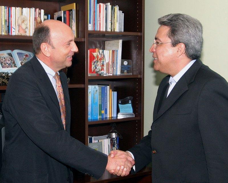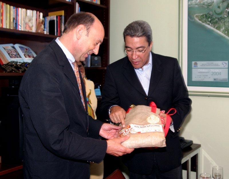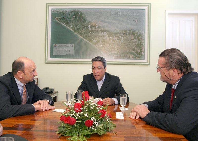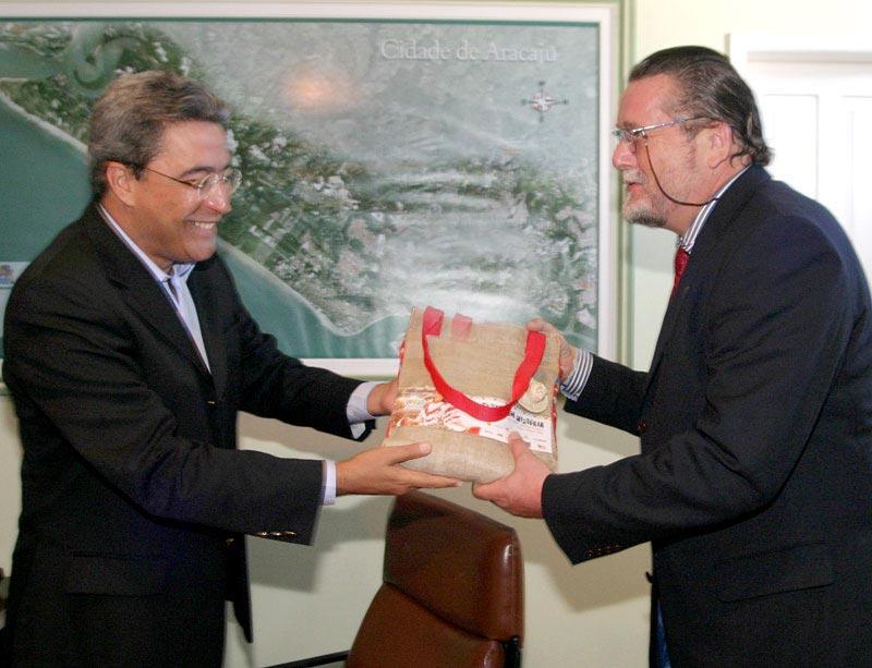 Durante a visita de cortesia que fez no final desta manhã ao prefeito Marcelo Déda, o cônsul geral da república Alemã para o Nordeste, Walter Weinderger, elogiou a cidade de Aracaju e disse estar impressionado com a beleza e organização da capital sergipana. Esta é a primeira visita que faço a Sergipe e não poderia deixar de conhecer o prefeito de Aracaju. Estou aqui há menos de dois dias, mas estou convencido de que Aracaju é um destino interessantíssimo para todos os turistas que aqui vierem aproveitar a cidade, enfatizou. O cônsul geral visitou o prefeito acompanhado de Hans Jürgen Dittebrandt, cônsul honorário da República Federal da Alemanha. O prefeito Marcelo Déda agradeceu a visita e ratificou as boas relações que o Brasil, especialmente Sergipe, mantém com a Alemanha. Em 1998, ainda deputado federal, ele participou de uma comitiva do Congresso Nacional que visitou a Alemanha para conhecer projetos e trocar experiências com aquele país. Esta é uma oportunidade significativa de reafirmarmos nosso interesse pelo país, cuja história e acontecimentos recentes nos chamam muito a atenção, disse ele, que lembrou a relação estreita que o intelectual sergipano Tobias Barreto mantinha com a cultura alemã, assim como o fato de um sergipano ter ocupado o cargo de prefeito de Hamburgo, uma das principais cidades da Alemanha. Ao final do encontro, Marcelo Déda presenteou os cônsules com dois kits do Forró-Caju 2005, que incluem camisas da festa, livros de artistas e autores sergipanos. O cônsul geral Walter Weinderger recebeu ainda uma medalha de bronze em comemoração aos 150 anos de Aracaju, especialmente cunhada pela Casa da Moeda do Brasil.