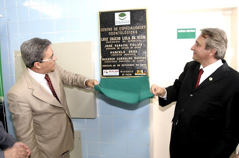 O prefeito de Aracaju, Marcelo Déda, e o ministro da Saúde, José Saraiva Felipe, inauguraram esta tarde o Centro de Especialidades Odontológicas (CEO) da Prefeitura Municipal de Aracaju, localizado no Cemar do conjunto Augusto Franco. Com 19 dentistas e 11 atendentes, o CEO está inserido no programa federal Brasil Sorridente, que até abril deste ano já havia implantado cerca de 140 unidades similares em todo o Brasil. Não podemos permitir que o Brasil pare por causa da crise. O Governo Federal tem o compromisso sério de combater profundamente todos os erros cometidos, mas a presença do ministro aqui para as três inaugurações que faremos hoje é a prova de que o trabalho para o povo feito pelos governos nacional e municipal não sofre com a crise, disse o prefeito Marcelo Déda. Em Aracaju, o CEO já está em funcionamento há dois anos com recursos próprios do município. Dois consultórios com três equipos odontológicos de dentista, um máquina de raio-X e uma para confecção de próteses dentárias, instalada recentemente, fazem o atendimento completo de cerca de 60 pacientes por dia. Com a readequação do espaço às especificações do Ministério da Saúde (MS), a partir de agora a unidade receberá um repasse mensal de R$ 8,8 mil. Nós temos acompanhado com alegria a evolução do esforço feito e os excelentes resultados que a administração do prefeito Marcelo Déda tem alcançado na ampliação e melhora constante dos serviços de saúde de Aracaju, avaliou o ministro Saraiva Felipe. O CEO está preparado para oferecer tratamentos de endodontia e periodontia, atendimento a pacientes especiais, cirurgia buco-maxilo-facial, diagnóstico de lesões na boca e raio-X. De acordo com o MS, até 2006 serão investidos mais de R$ 1,3 bilhão na política de Saúde Bucal de Aracaju. Atualmente, todas as unidades de saúde família de Aracaju dispõem de dentistas, que integram as equipes do Programa de Saúde da Família (PSF) do município. Em todo o Brasil, já existem 9.441 equipes de saúde bucal distribuídas em 3.245 municípios. Pronto-Socorro zona Sul Depois de inaugurar o CEO, o ministro e o prefeito visitaram as obras do Pronto-Socorro Municipal da zona Sul, que está sendo construído com recursos do Governo Federal e contrapartida da Prefeitura de Aracaju. Marcelo Déda e o secretário municipal de Saúde, Rogério Carvalho, mostraram toda a estrutura do pronto-socorro ao ministro, destacaram a relevância da obra para a comunidade e reafirmaram o importante papel que o MS desempenha em sua execução. Somado ao pronto-socorro da zona Norte, Nestor Piva, que iremos visitar daqui a pouco, nós teremos em Aracaju um grande controle geográfico para o atendimento de urgência e emergência da população de toda a cidade, explicou o prefeito Marcelo Déda. Os 60 leitos e o atendimento que será prestado nos pronto-socorros do município vão diminuir o fluxo de pacientes que entram no Hospital Cirurgia e deixar a reserva hospitalar existente na capital para atender os casos realmente mais graves. A estrutura física das unidades será composta de salas para assistência social, consultórios médicos, salas de estabilização, postos de enfermagem, vacinas, inalação, reidratação, medicação, sutura, curativo, gesso, higienização, procedimentos invasivos, farmácia e salas para realização de exames como raio-X e eletrocardiograma (ECG). Três áreas verde, amarela e vermelha vão organizar o serviço de modo que quanto maior a gravidade do caso, mais rápido o paciente será atendido. As atividades prosseguem Ainda hoje o ministro Saraiva Felipe vai inaugurar a unidade de saúde da família Cândida Alves, no bairro Santo Antônio, e a primeira Farmácia Popular de Sergipe, situada à rua de Estância e trazida a Aracaju numa parceria com a prefeitura da cidade. O ministro Saraiva Felipe e sua comitiva foram recepcionados no início da tarde no aeroporto de Aracaju pelo prefeito Marcelo Déda e pelo vice Edvaldo Nogueira. Também estiveram no aeroporto os secretários de Saúde Rogério Carvalho (Município) e José Lima Santana (Estado), além da deputada estadual Ana Lúcia Menezes, do vereador Emanoel Nascimento e diversos secretários da PMA. O deputado federal Jorge Alberto acompanhou o ministro durante a viagem a Aracaju, integrando a comitiva. Já na inauguração do Centro de Especialidades Odontológicas estavam os deputados federais Jackson Barreto e Heleno Silva, o deputado estadual Francisco Gualberto, além de autoridades do interior do Estado.