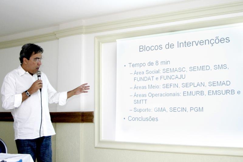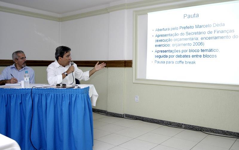 O prefeito de Aracaju, Marcelo Déda, e o vice-prefeito Edvaldo Nogueira estão reunidos durante todo o dia de hoje com o secretariado municipal no Hotel Aquários para avaliar as realizações de cada área do governo nos últimos anos, especialmente em 2005, e planejar as metas a serem atingidas até o primeiro semestre de 2006. Cada secretário está apresentando o que já foi feito em sua pasta e definindo suas novas prioridades. Além de examinar a performance de cada secretaria, vamos socializar a experiência de governo entre todos de forma que cada um tenha a visão completa da administração e não apenas de sua pasta, explicou o prefeito Marcelo Déda. Isto vai fortalecer a nossa integração e dar unidade de ação ao governo, acrescentou. O encontro começou com a explanação do secretário municipal de Finanças, Nilson Lima, sobre o fechamento do exercício 2005, a obediência à Lei de Responsabilidade Fiscal (LRF) e os procedimentos para a execução orçamentária deste ano. Em seguida os secretários fizeram suas apresentações em quatro blocos seguidos de debates. Primeiro apresentaram seus resultados e novas prioridades as secretarias da área social: Assistência Social e Cidadania, Educação, Saúde, Trabalho e Cultura, Turismo e Esportes. Depois foi a vez da secretarias-meio: Finanças, Planejamento e Administração; seguidas pelas secretarias operacionais de Serviços Urbanos, Obras e Urbanização e Transportes e Trânsito. A parte da manhã foi encerrada com as apresentações do chamado bloco de suporte que inclui a Guarda Municipal, Aracaju Previdência, Controle Interno e Procuradoria Geral do Município. Já no período da tarde o prefeito vai passar orientações para a manutenção do equilíbrio fiscal do município, cumprimento de metas e compromissos com os servidores e fornecedores da prefeitura. Vamos estabelecer um cronograma de ações para o final deste ano e o primeiro semestre de 2006 para que possamos dizer à cidade o que já produzimos e porque nossos resultados são o alicerce que nos estimula e autoriza a pensar em novos projetos para Aracaju, finalizou o prefeito Marcelo Déda.