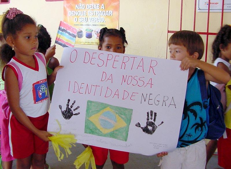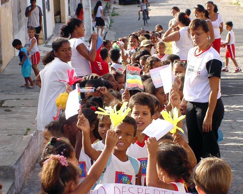 Pelo terceiro ano consecutivo os alunos da Escola Municipal de Ensino Infantil (EMEI) Maria Cláudia Machado, do bairro Santos Dumont, participaram da marcha pela consciência negra e em busca do Despertar da Identidade negra na educação infantil. Todos os 425 alunos, de 4 a 6 anos, participaram do evento na tarde de hoje, 30, acompanhados de seus educadores, familiares e animados pela percussão do grupo Axé Kizomba. Segundo a coordenadora geral da escola, Leila Argolo, a programação integra o projeto pedagógico trabalhado na instituição com o apoio da Secretaria Municipal de Educação (Semed). O tema foi antes trabalhado em sala de aula em diversas atividades. Nós oportunizamos às nossas crianças refletirem sobre a mistura que compõe a nossa raça. Isso possibilita o reconhecimento de que todos somos iguais, independente da cor da pele. Foi com esse espírito que os alunos saíram às ruas do bairro Santos Dumont empunhando cartazes e faixas com os emblemas todos iguais e não ao preconceito, entre outras. De acordo com a coordenadora é desde cedo que deve ser desenvolvida nas pessoas uma consciência crítica que possibilite ações e atitudes positivas. Além disso, Leila Argolo afirma que a escola utiliza-se da marcha como recurso pedagógico para socializar os resultados da produção interna e planejar interferências mais coordenadas na comunidade, que visam considerar nossos objetivos centrais que é o desafio de transformar a escola num espaço pleno de cidadania, informou a coordenadora.