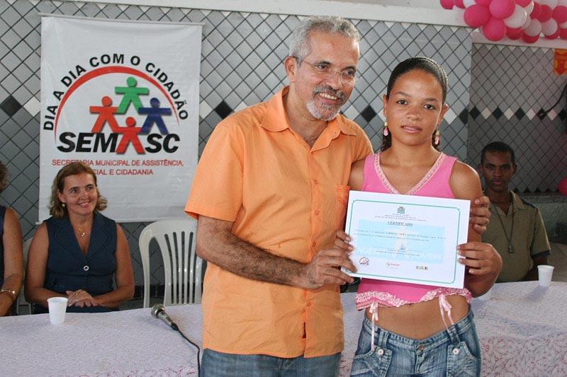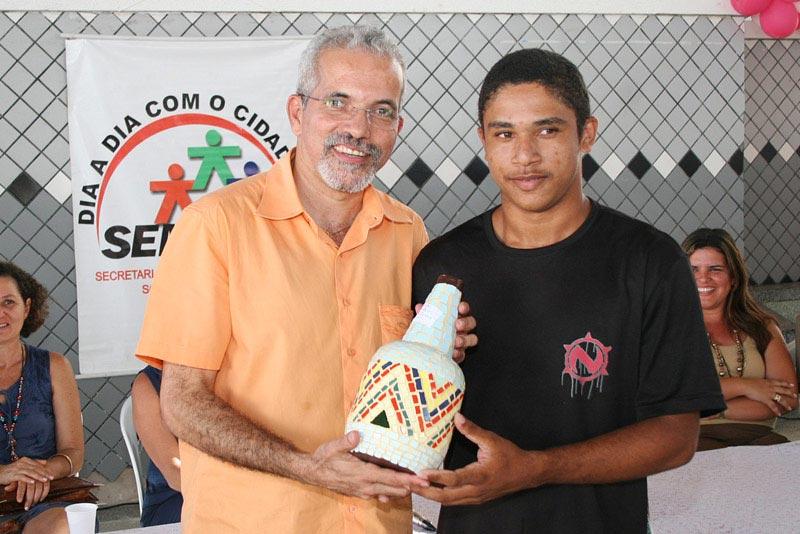 O prefeito de Aracaju, Edvaldo Nogueira, participou na tarde de ontem da festa de encerramento das oficinas do Programa ´Agente Jovem 2006´. Acompanhado da secretária municipal de Assistência Social e Cidadania, Rosária Rabelo, o prefeito assistiu às várias apresentações artísticas dos jovens atendidos pelo Programa, além de entregar o diploma do curso a dois adolescentes. O evento foi a forma que a Secretaria Municipal de Assistência Social e Cidadania (Semasc) encontrou para parabenizar todos os jovens inseridos no Programa que foi realizado este ano e entregar os certificados a cada participante. Estiveram reunidos 200 jovens entre 15 e 17 anos, de localidades carentes da capital. Ao final do evento foi servido um coquetel e o prefeito Edvaldo Nogueira levou para casa uma peça de mosaico trabalhada pelos adolescentes do Programa. De acordo com o prefeito Edvaldo Nogueira, a execução desse Programa é uma maneira da administração municipal mostrar que é importante a participação da juventude no meio social onde vive. É essencial que o jovem tenha consciência do seu papel na sociedade. Além de ter contato com elementos da cultura, o Programa possibilita a eles se transformarem em cidadãos, afirma. A juventude aracajuana tem gente criativa que só precisa de oportunidade. E o Programa abre portas para que estes jovens possam canalizar os esforços num grande papel social, desenvolvendo aptidões e entrando no mercado de trabalho. Vim aqui para reafirmar o compromisso da Prefeitura com este Programa que é muito importante para nós, comenta Edvaldo Nogueira. A secretária Rosária Rabelo salienta que este foi um momento de troca, de integração entre as turmas e do que representou o Agente Jovem para cada um dos adolescentes. Eles vieram demonstrar o que cada turma aprendeu e traduzir tudo através do teatro, diz Rosária, acrescentando que um dos grupos de teatro conseguiu até um registro do Sindicato dos Artistas e Técnicos em Espetáculos de Diversões (Sated), fruto do trabalho desenvolvido nas oficinas. O Programa tem como meta estimular o protagonismo do jovem para que descubra o seu potencial e tenha atitudes na comunidade. Dentro do Agente Jovem aprendem a fazer a leitura do diagnóstico da comunidade e traçam um plano para mudar a situação de forma lúdica, através do teatro, da música, das artes plásticas, informa a secretária Rosária Rabelo. Agente Jovem Executado pela Secretaria Municipal de Assistência Social e Cidadania (Semasc), o Programa Agente Jovem atende adolescentes em situação de risco e vulnerabilidade social em bairros carentes da cidade. O objetivo do Programa é transformar estes jovens em agentes multiplicadores de cidadania. Este programa social do Governo Federal tem as aulas ministradas por uma equipe de educadores sociais dos Centros de Referência de Assistência Social, instalados em bairros diversos. Entre as atividades que o Programa desenvolve com os jovens estão as Oficinas Sócio-educativas e Culturais, a exemplo das Oficinas de Flauta, Violino, Artes Manuais e Mosaico que vêm revelando grandes talentos entre estes adolescentes. Adolescentes O Programa Agente Jovem, existente desde 2002, vem dando várias oportunidades aos adolescentes que vivem em situação de risco e vulnerabilidade social em suas comunidades. Prova disso é o sorriso estampado no rosto da adolescente Chennya Roberta Santos, de 17 anos, que cantou rap durante a apresentação do evento. Trouxe minha irmã e minha mãe para participar da festa. O Programa foi tão bom que, se pudesse, continuaria participando, revela Chnnya. Minutos antes de preparar o violão para a apresentação no evento junto com os colegas, o adolescente de 16 anos, Paulo Sérgio dos Santos Junior, não escondia a felicidade de ter participado de temáticas tão interessantes. Gostei demais do Programa, foi muito bacana. A gente se esforça para apresentar a todo mundo um bom musical, então o prazer é meu de participar deste evento. Também foram muito legais as amizades que fiz aqui. Era muito acanhado e hoje perdi a timidez, reforça Paulo Sérgio. Uma das educadoras do Programa, Vanessa Nascimento, explica que eles não dão trabalho nas oficinas porque criam as próprias regras. Quando chegam ao final do curso, já estão autônomos, independentes. Eles se tornam multiplicadores de informações. Estou muito orgulhosa e feliz pela formação desses jovens, fala Vanessa, orientadora de duas turmas, uma no Santos Dumont e outra no Lamarão.
