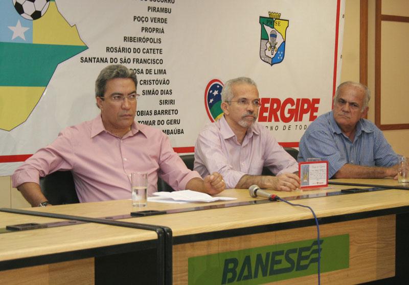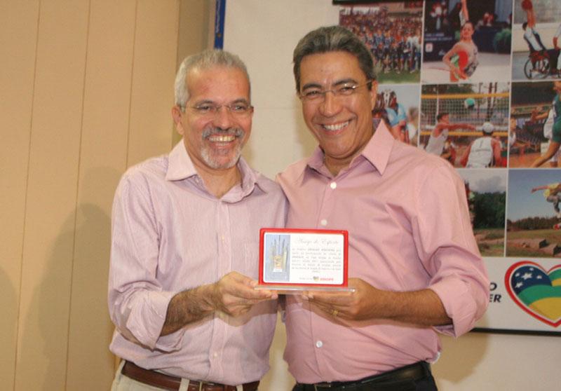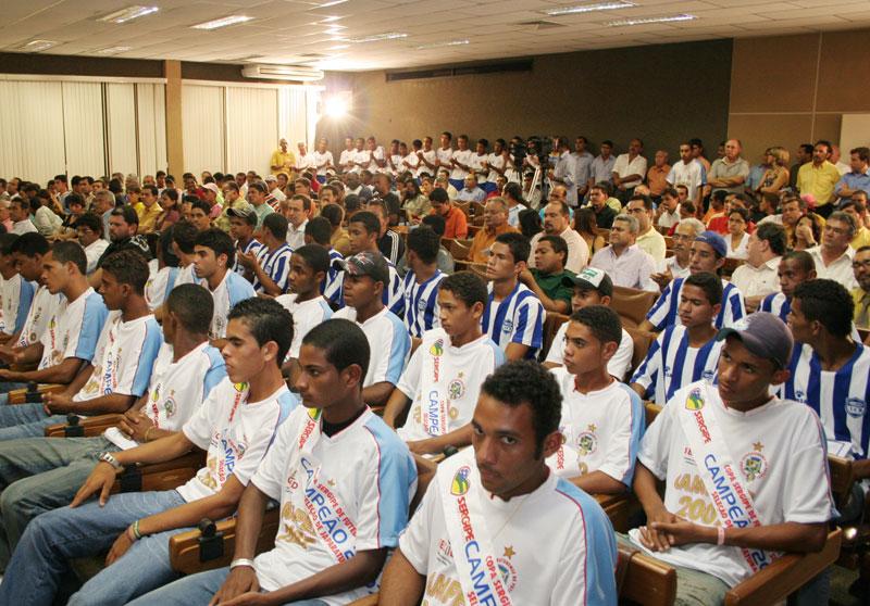 O prefeito de Aracaju, Edvaldo Nogueira, recebeu na tarde desta quinta-feira o troféu Amigo do Esporte das mãos do Governador do Estado de Sergipe, Marcelo Déda, em solenidade promovida pela Secretaria de Estado do Esporte e Lazer (SEEL) no auditório do Banco do Estado de Sergipe (Banese). A seleção de Aracaju participou da Copa Sergipe de Futebol Sub-17, e contou com todo apoio logístico e organizacional da Prefeitura Municipal de Aracaju (PMA), por meio da Fundação Municipal de Cultura, Turismo e Esporte (Funcaju). Está Copa foi uma grande iniciativa do Governo de Sergipe, que conseguiu reunir 38 equipes de todo o Estado. Aracaju participou da competição contando com o incentivo da PMA, que vem sempre colaborando com o desenvolvimento do esporte na capital, principalmente quando se trata da inclusão de jovens, explica Edvaldo. Para o prefeito, o esporte é um instrumento fundamental para buscar diminuir a desigualdade e integrar as pessoas. Em torneios como esse é que surgem os craques. Esta é a oportunidade para a garotada mostrar sua qualidade e, assim, ganhar visibilidade, fala Edvaldo. Marcelo Déda entregou o troféu Amigo do Esporte aos prefeitos que tiveram as seleções de sua cidades fazendo parte da Copa Sergipe de Futebol Sub-17. De acordo com Déda, este troféu é o reconhecimento do Estado aos prefeitos pelo empenho que dedicaram à organização das equipes. A força de vontade dos prefeitos em participarem desta Copa foi que a transformou em um celeiro de craques, portanto, um sucesso, destaca Déda. Fizeram parte da mesa, junto ao governador Marcelo Déda, o prefeito da capital, Edvaldo Nogueira; a deputada estadual, Conceição Vieira; o secretário do Estado de Esporte e Lazer, Leó Filho; o presidente da Federação Sergipana de Futebol, Carivaldo Souza; e o representante da Associação dos Cronistas Desportivos de Sergipe, Alceu Monteiro. Estiveram presentes ainda diversas autoridades, prefeitos e representantes dos 38 municípios participantes da Copa Sergipe de Futebol Sub-17, atletas, dirigentes de clubes, jornalistas e público em geral.