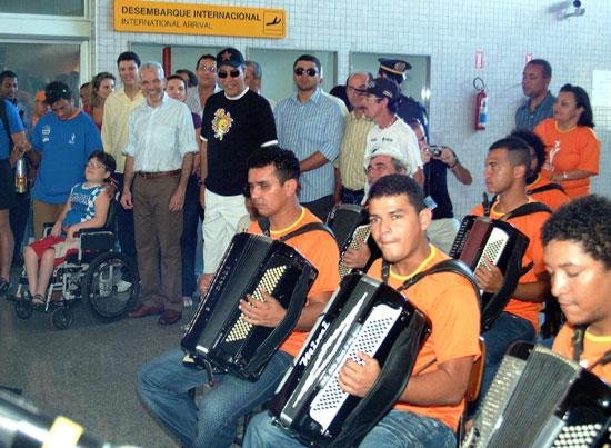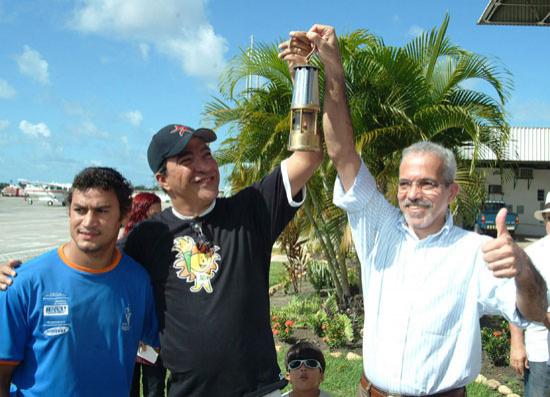 Já está em solo aracajuano a Tocha dos Jogos Pan-americanos Rio 2007, símbolo maior do evento, que representa a integração dos povos. A Tocha desembarcou no aeroporto da capital sergipana por volta das 13 horas de hoje, domingo. O pugilista Acelino Freitas, o Popó, embaixador da Tocha em Sergipe, fez a entrega do símbolo, ainda na pista de pouso, ao prefeito de Aracaju, Edvaldo Nogueira, e ao governador do Estado, Marcelo Déda. A recepção à Tocha contou com a presença de deputados, secretários municipais e estaduais, entre outras autoridades. É uma emoção muito grande ser embaixador da Tocha e poder ajudar a divulgar cada vez mais o esporte. Convido a todos a participarem desse momento histórico. Parabenizo o prefeito, o governador e o COB (Comitê Olímpico Brasileiro) por essa festa, disse Popó. A recepção à Tocha foi em clima junino, já que a cidade vive seu momento cultural mais representativo, que é o São João. A quadrilha Unidos do Sertão deu as boas vindas e logo em seguida a Orquestra Sanfônica de Aracaju executou o Hino Nacional e Asa Branca. Em nome do povo de Aracaju, quero dar as boas vindas à Tocha, um símbolo de paz e união entre os povos. É um momento muito importante, de muita alegria para Aracaju. Foi muito bom a Tocha chegar em Aracaju nesse momento significativo que é o São João. É uma oportunidade de mostrar ao Brasil e ao mundo a nossa cultura, que é baseada no forró. Aracaju se preparou e vai mostrar tudo que tem de bom, afirmou o prefeito Edvaldo Nogueira. O governador Marcelo Déda destacou a importância da passagem da Tocha pelo Estado. Para Sergipe é um orgulho imenso participar do roteiro da Tocha do Pan. Tenho certeza que o fogo que desce agora em solo sergipano vai sair daqui mais aceso, com a chama do São João e com o calor do sergipanos, que desejam boa sorte aos jogos no Rio, destacou. Do aeroporto, a Tocha seguiu de helicóptero até a Colina do Santo Antônio, onde teve início o revezamento. Por um percurso de 24 km, 60 pessoas vão levá-la até a Passarela do Caranguejo, na orla da Atalaia. Confira galeria de fotos do evento