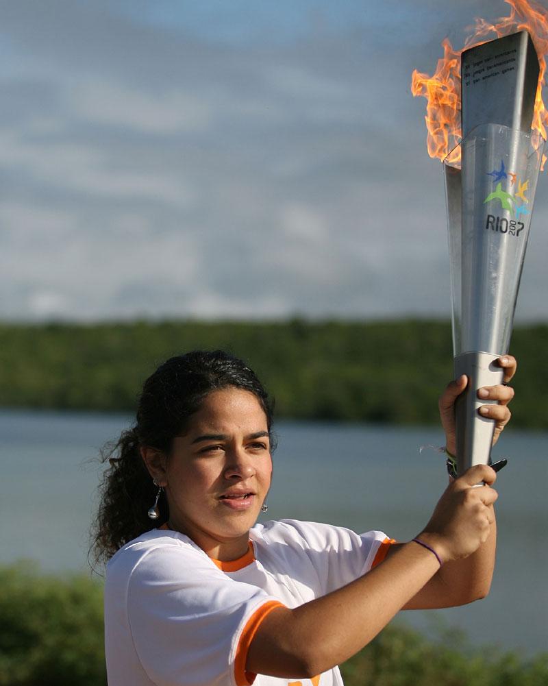 A cidade de Canindé de São Francisco, a cerca de 213 km da capital sergipana, parou para festejar na manhã de hoje a chegada da Chama Pan-Americana e a realização do revezamento da tocha às margens do Rio São Francisco e pelas ruas da cidade. As casas foram todas enfeitadas, ruas e praças tinham inúmeras bandeirinhas e, no Forródromo, foi montada uma réplica da antiga Canindé. Os moradores, de mãos dadas, fizeram um grande cordão de isolamento em todo o percurso para a passagem do comboio. O evento contou com a presença dos descendentes de Virgulino Pereira da Silva, o Lampião, e Maria Gomes de Oliveira, a Maria Bonita, mortos por soldados na Grota do Angico, em 1938, junto com um grupo de nove cangaceiros. Luana Oliveira, bisneta do casal, recebeu a Tocha Pan-Americana Rio 2007 das mãos do prefeito Orlando Andrade e abriu o revezamento à beira do Lago do Xingó. Com 18 anos, nascida em Sergipe e ex-integrante a seleção estadual de natação, Luana mora hoje em São Paulo, onde estuda psicologia, mas não abandonou suas raízes. “A emoção de resgatar a tradição da minha família junto com esporte foi muito grande”, garantiu ela. Participaram ainda da cerimônia de abertura a filha única do casal, Expedita Ferreira, e seu marido, Manoel Menezes; os pais de Luana, Iza Ferreira e Heibaldo Andrade; e os netos, Djair, Gleusa e Vera Ferreira. No revezamento estiveram também a parteira Josefa Maria, famosa por já ter acompanhado o nascimento de mais de 5 mil bebês, e Zé Leobino, de 83 anos, fundador do grupo folclórico Cavalhada, que conduziu a tocha com trajes típicos e montado a cavalo. Confira galeria de fotos do evento