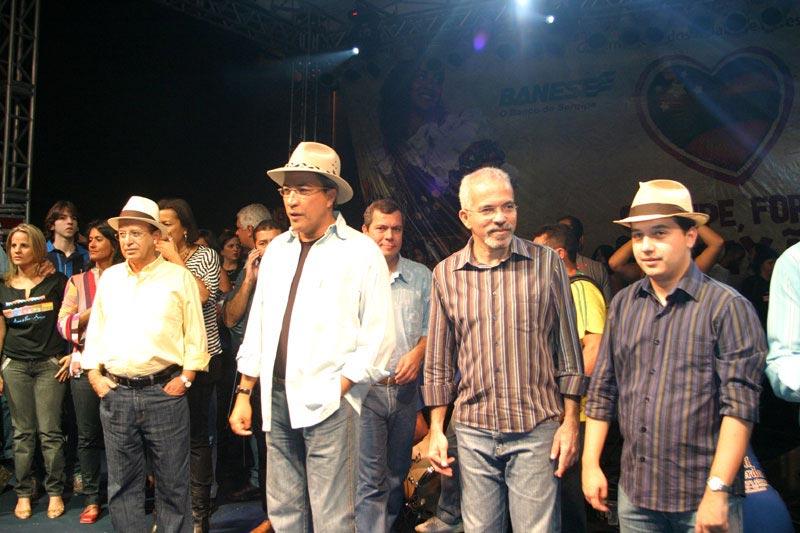 O prefeito de Aracaju, Edvaldo Nogueira, esteve presente na noite de sexta-feira, dia 1º, ao Arraiá do Povo, montado na Orla de Atalaia. Lá, o governador do Estado, Marcelo Déda, fez a abertura oficial da temporada de festejos juninos na capital sergipana. Por meio de uma parceria entre o Governo de Sergipe e a Prefeitura da Cidade, Aracaju terá uma programação ainda mais diversificada durante todo o mês de junho. A proposta de ambos os órgãos públicos é somar forças para atender aqueles que prestigiam o melhor São João do país. Além disso, a parceria trouxe economia de recursos públicos, já que as programações do Arraiá do Povo e do Forró Caju foram pensadas conjuntamente para o povo, sem gerar nenhum tipo de concorrência entre si. Déda destacou, em seu discurso de abertura dos festejos na capital, ao lado do prefeito Edvaldo, o significado da parceria do Estado com os municípios, ao invés de serem adversários. Ao lado de Edvaldo Nogueira vamos fazer uma festa para todos. Juntos, trabalhando em prol da cultura, pregando a paz e a harmonia, iniciamos hoje as festividades do Forró de Todos. O Arraiá do Povo irá se somar ao Forró Caju, contudo este ano Sergipe será um arraiá só, afirmou o governador. Apoiando o discurso de Déda, Edvaldo disse que com essa parceria quem ganha é o povo. Vamos fazer o melhor São João do país. Todos irão poder desfrutar da melhor programação junina do Nordeste, nesta primeira quinzena - aqui no Arraiá do Povo -, e, a partir do dia 15, teremos o Forró Caju, um evento que, sem sombra de dúvida, atrai muitos turistas. Alguns hotéis já estão com lotação máxima para as datas mais quentes do forró - São João e São Pedro, comentou o prefeito, ressaltando que Aracaju está crescendo muito em diversos setores, e a cultura tem um papel muito importante, pois gera empregos temporários e movimenta a economia. Também prestigiaram a noite de sexta-feira diversos secretários municipais e estaduais, presidentes de órgãos municipais e estaduais, parlamentares municipais, estaduais e federais e empresários. Nesta primeira noite do Arraiá do Povo, Rogério, Genival Lacerda e Adelmário Coelho animaram o palco oficial da festa.