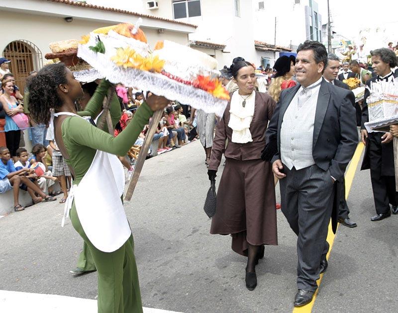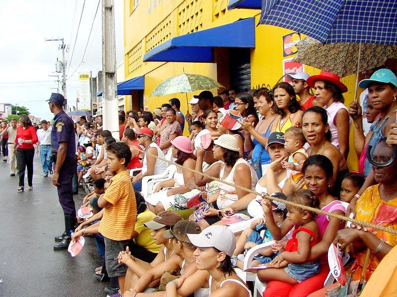 A rua Bahia ficou apertada na manhã de ontem, por conta do número de pessoas que foi assistir o desfile cívico da rede municipal da Educação e aprender muita coisa sobre a história da capital. Cada espaço vago era disputado por quem estava na rua querendo ver cada pelotão e as alegorias apresentadas. Nem mesmo a forte chuva que caiu durante o início da festa dispersou o público, que embaixo de toldos, marquises e dividindo sombrinhas, permaneceu para ver cada detalhe da festa. As sacadas das casas também foram locais disputados, pois serviram de camarote para os moradores da rua e amigos, que acabaram tendo um ângulo de visão bastante privilegiado. Os alunos das unidades escolares, por sua vez, deram um show durante as apresentações, o que fez com que o público vibrasse e ficasse encantado com cada encenação. Para Helenaldo Santana, morador do Siqueira Campos, que levou a esposa e o filhinho de apenas um ano e dois meses, a festa foi uma das mais belas que ele já viu. Valeu a pena acordar um pouco mais cedo para prestigiar tamanho espetáculo. Está tudo muito bom, a organização e principalmente o conteúdo mostrado, pois para aqueles que não conheciam a história da cidade, através deste desfile, puderam fazer uma associação com a história e aprender mais sobre Aracaju. Esse ano foi muito melhor do que os anteriores, declarou. E este tipo de opinião também foi confirmada pelas crianças residentes no bairro, a exemplo das meninas Tatiane Moura Santos e Tamires Santos, ambas com 12 anos de idade, que compreenderam a temática do desfile, além de terem achado tudo muito organizado. A parte que mais gostaram foi a do bolo. Ficou lindo, bem feito. Nunca tínhamos visto um desfile assim, com tantos desenhos, com tantas histórias, com tantos personagens, comentaram.