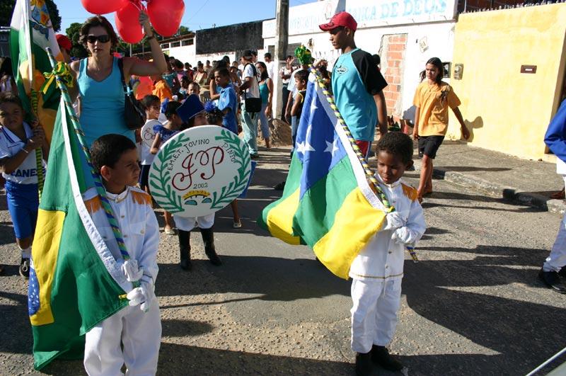 Alunos de escolas da rede municipal da Educação localizadas nos bairros Aeroporto e Atalaia participaram neste final de semana de mais um desfile cívico em comemoração ao mês da Pátria. As Escolas Municipais de Educação Infantil e ensino Fundamental Jovino Pinto e Anísio Teixeira desfilaram pelas ruas do conjunto Santa Tereza, no final da tarde da última sexta-feira. O desfile, que teve início na rua Alceu Amoroso Lima, percorreu as principais avenidas do conjunto, quando os alunos demonstraram entusiasmo por estarem representando suas escolas, que abordaram o aniversário de 150 anos da capital. Cerca de 160 crianças da unidade escolar Jovino Pinto, com idade aproximada de seis anos, mostraram na avenida temas como Eu amo Aracaju, O sítio do pica-pau amarelo, A magia do circo, Profissionais não nascem, se capacitam dia após dia" e "Esporte é vida. Os pequenos estudantes estavam caracterizados de palhaços, bailarinas, e esportistas. Os estudantes da Emei. Jovino Pinto desfilaram ao som das marchas tocadas pela banda da Escola Municipal de Ensino Fundamental Freitas Brandão. O primeiro pelotão a desfilar foi a Guarda Solidária da Criança e do Adolescente (GSCA), seguido pela Emei. Jovino Pinto, Escolinha Divina Providência, Emef. Anísio Teixeira, Colégio Santos Dumont. O desfile foi encerrado com a escola Alceu Amoroso, que foi puxada pela banda da Escola Municipal de Ensino Fundamental Juscelino Kubitschek. Segundo a coordenadora geral da Emei. Jovino Pinto, Maria Clara Hora Lima, todos contribuíram para a bela exibição que a escola realizou na avenida. "Tanto pais, alunos, professores, bem como a população em geral, estiveram envolvidas na confecção das vestimentas. O desfile, que já é uma tradição nessa época, teve como diferencial este ano a união de todas as unidades escolares do bairro, fossem da rede pública ou da particular. Juntos ressaltamos o nosso amor pela pátria, disse.