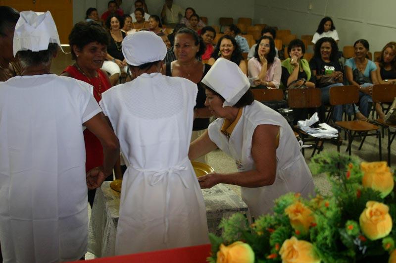 Na tarde desta quinta-feira, dia 20, a Secretaria Municipal de Educação (Semed) realizou o encerramento oficial do Curso de Capacitação de Merendeiras, promovido em parceria com o Fundo Nacional de Desenvolvimento de Educação (FNDE). Em clima de confraternização, o curso foi encerrado com sorteio de brindes e um coquetel festejando os resultados positivos. A solenidade ocorreu no auditório do Centro de Aperfeiçoamento de Recursos Humanos (Cemarh), no Siqueira Campos. O curso, iniciado semana passada, envolveu 51 merendeiras da rede municipal e abordou tópicos como higiene na manipulação de alimentos, higiene do ambiente e higiene dos utensílios, higiene pessoal, noções de microbiologia, doenças de origem alimentar, acondicionamento de alimentos, gerenciamento de resíduos, controle de pragas, valor nutricional dos alimentos e receitas de baixo custo e alto valor nutritivo. Ainda foi ministrado um tópico específico sobre a importância do trabalho desenvolvido pela Vigilância Sanitária que, através da assessoria de Educação, Informação e Comunicação, teve papel fundamental com a participação de técnicos que desenvolveram o conteúdo programático do curso. A parte prática foi realizada na cozinha da Unidade Produtiva da Fundat, no bairro Jardim Esperança. Segundo a secretária municipal de Educação (interina), Tereza Hortência Azevedo, o curso proporcionará uma nova dinâmica e um salto de qualidade nos serviços oferecidos pela rede municipal de ensino. Essa é uma inovação proposta pelo Ministério da Educação, que consiste em oferecer uma capacitação continuada também aos profissionais de apoio na rede de ensino, enfatizou. Complementando, o diretor do Departamento de Nutrição e Alimentação Escolar da Semed, Ronaldo Cruz Silva, destacou a importância desta troca de experiências e oferta de novas informações como instrumento de motivação para as profissionais que alimentam os alunos da rede municipal. É um momento de extrema importância, pois o respeito e a qualidade do curso que estamos oferecendo certamente refletirão na qualidade da nossa merenda escolar, que já é de alta qualidade, disse. Aproveitamento A merendeira mais antiga de rede municipal, Maria Eulina Barreto Nascimento, que há 26 anos prepara a merenda para as crianças da escola Deputado Jaime Araújo, no bairro Soledade, fez questão de ressaltar a importância dos conhecimentos que adquiriu: É muito bom saber da importância que pequenas coisas podem ter para nossa saúde e o resultado do nosso trabalho. Faço tudo com amor e, a partir de agora, terei muito mais satisfação em ver o sorriso das crianças quando recebem um prato gostoso e bonito, afirmou a merendeira. É muito bom conhecer coisas novas. Muitos detalhes que fazem uma grande diferença para nossa saúde através dos alimentos. Fiquei muito contente em ter participado como acho que todas também estão, opinou a merendeira Lídia Santos de Jesus, há 18 anos na rede municipal. No final da solenidade foi realizado um sorteio de brindes oferecidos pelos fornecedores da merenda escolar da Semed e um coquetel que celebrou a importância do evento.