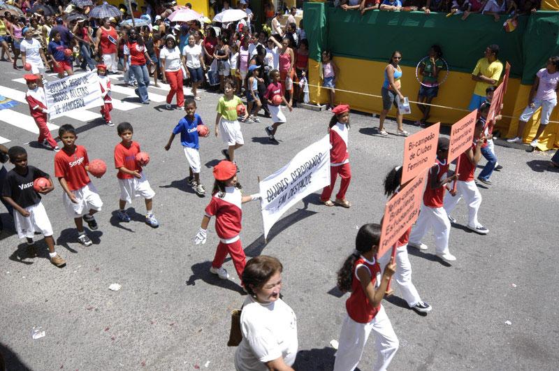 No Desfile Cívico da Rede Municipal de Educação, os diversos métodos para o desenvolvimento da ginástica, os atletas sergipanos e nacionais que conquistaram medalhas e todas as versões das olimpíadas modernas foram apresentadas ao público, a exemplo dos jogos de Berlim -1936-, Moscou em 1980 e Barcelona em 1982. Uma das presenças que mais chamou a atenção de quem esteve na Rua Bahia durante toda a manhã de ontem foi a da ginasta Larissa Barata, que desfilou junto com as atletas de Ginástica Rítmica da Escola Municipal de Ensino Fundamental Santa Rita de Cássia, onde é desenvolvido o projeto Ginástica Escola Aberta. Os mascotes e as roupas típicas dos países que sediaram as competições também estiveram presentes na avenida. Nunca vi nada tão bonito, este é o segundo ano que prestigio um desfile bem feito, bem organizado e com coisas belíssimas, declarou a dona de casa Maria José Santos, moradora da Rua Bahia há mais de 30 anos. Ela acompanhou de perto todas as edições do desfile cívico da rede municipal de ensino, iniciados nos primeiros anos da década de 70, durante a gestão do então prefeito Cleovansóstenes Pereira de Aguiar. Dentre as várias modalidades e competições homenageadas pelos alunos estiveram a corrida 17 de março, realizada anualmente para lembrar a mudança da capital de Sergipe de São Cristóvão para Aracaju. Alunos vestidos com roupas utilizadas na prática do judô, karatê, taekwondo, boxe, capoeira, natação e automobilismo compuseram diversos pelotões. Membros da federação sergipana de ciclismo também estiveram na avenida fazendo apresentações das modalidades competitivas, como a bmx. Outros esportes muito explorados foram os que utilizam a bola como instrumento principal, a exemplo do futebol, handball e vôlei. Atletas e ex-atletas de algumas modalidades desfilaram, a exemplo da coordenadora geral da EMEF. Dom José Vicente Távora, Maria Auxiliadora, primeira sergipana a integrar a seleção brasileira de handball, na década de 80. As brincadeiras de rua e de calçada, a exemplo da pipa, elástico e bola de gude não foram esquecidas durante o evento. Acho legal estar representando algo que conheço muito bem, como as brincadeiras de rua, comentou um dos alunos da EMEF. Manoel Bomfim, que apresentou no desfile todos os aspectos deste tipo de atividade.